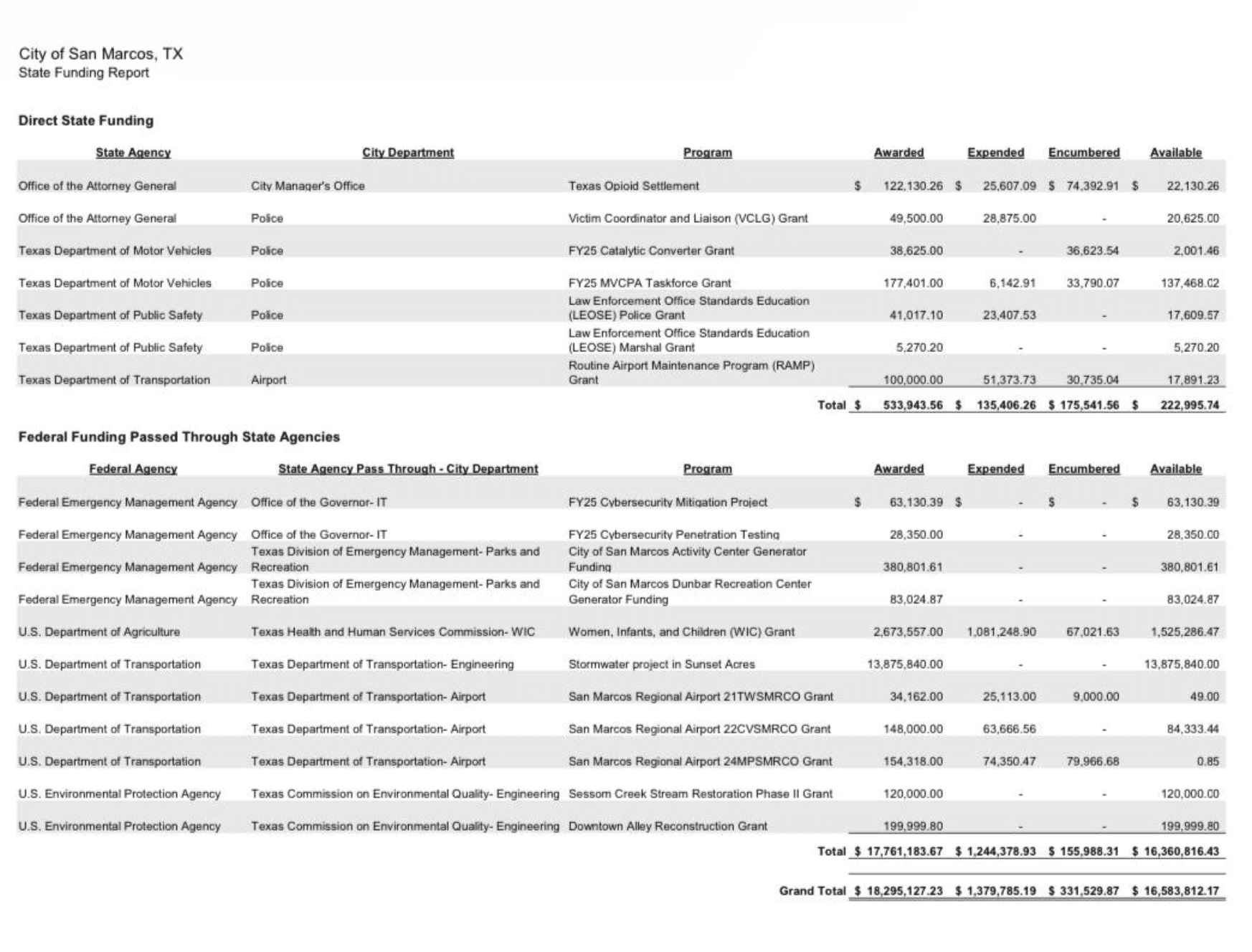 That’s according to a spreadsheet shared among city council members in the lead up to the vote on the resolution, which was provided to Deceleration by the group Palestine Solidarity SMTX. Over $18 million in federal funding which the state passes on to San Marcos could also be at risk, including over $2 million in grants from the Women, Infants and Children program, which ensures vulnerable residents have access to nutritious food.