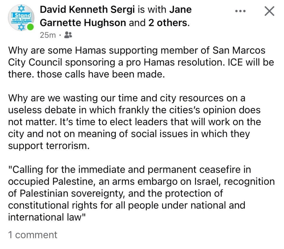 Cove told Deceleration that, since the vote was scheduled, city council members and supporters of the measure have received violent threats online. He shared a screenshot of a Facebook post by David Kenneth Sergi, a local lawyer, tagging the mayor while describing the resolution as “pro Hamas.”