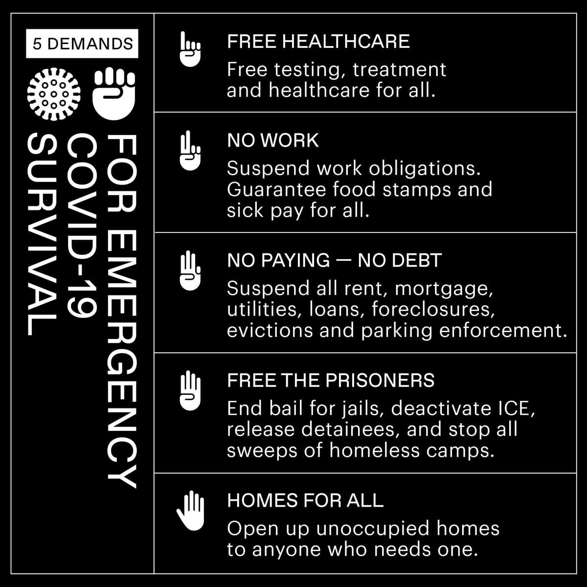 As many governments have so terribly botched their response to this virus, several groups have put together lists of demands for municipal and state governments. Don’t be boring, use these and other tactics for effective action on these demands!