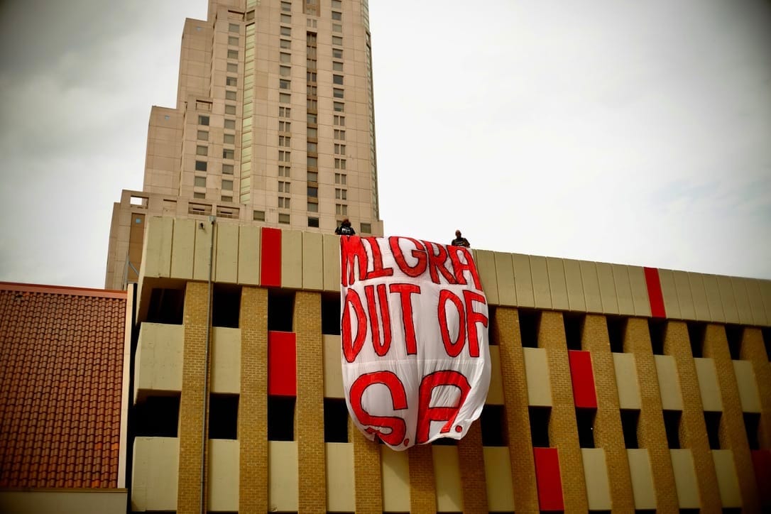 As local residents gathered below began to chant, a massive banner unfurled from atop of the Grand Hyatt SA parking garage in downtown San Antonio. Cheers went up. Towering red letters read: “Migra Out of SA.”