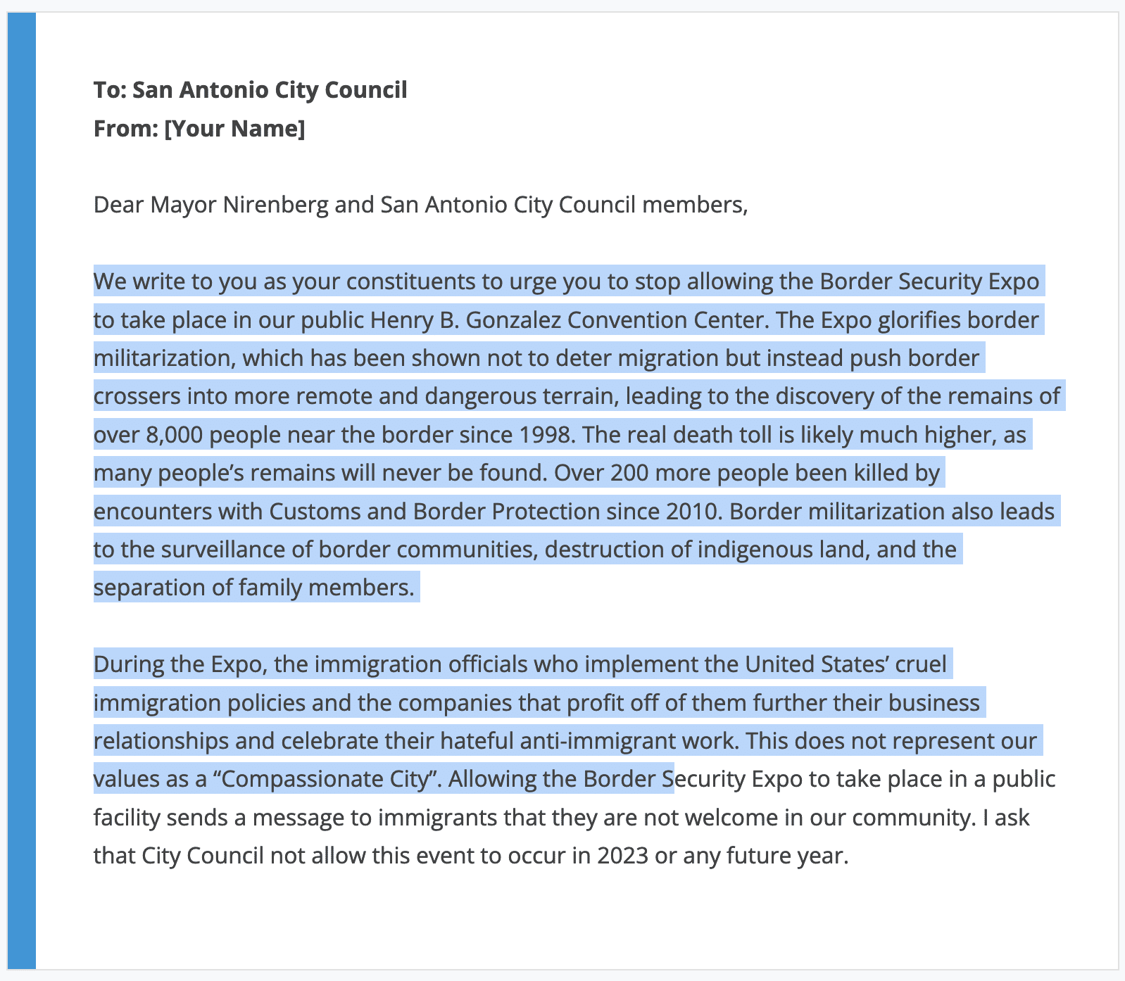 As a self-defined “Compassionate City,” San Antonio must redefine “security” to mean access to food, housing, health care, education, and work, not border militarization that only benefits politicians and private companies. We demand a compassionate San Antonio that envisions, fosters, and creates a welcome home for immigrants, not one that enables those who terrorize them. Please sign the petition to tell Mayor Ron Nirenburg and the rest of the San Antonio City Council not to allow the Border Security Expo in our Convention Center in 2023 or ever again.