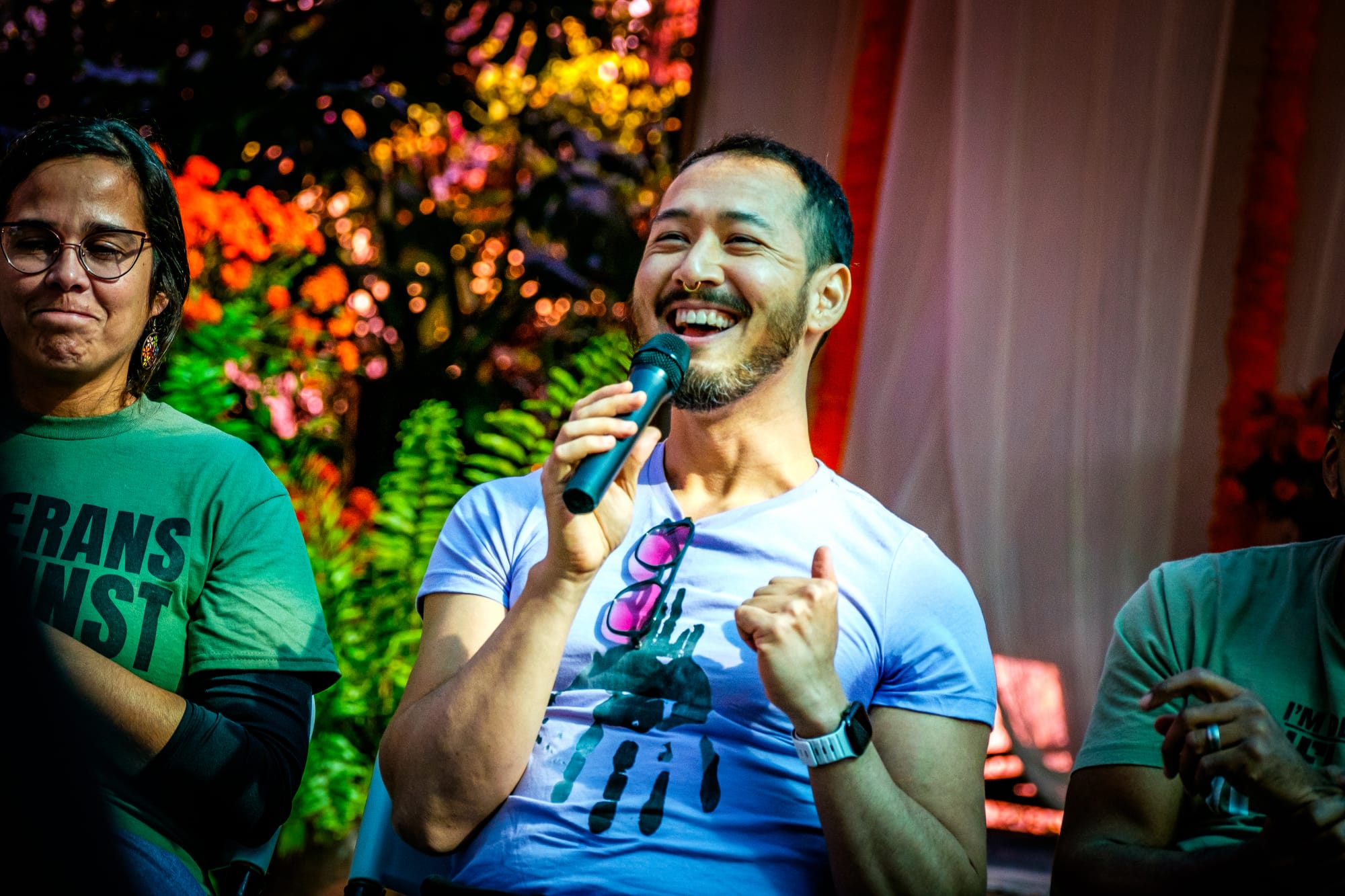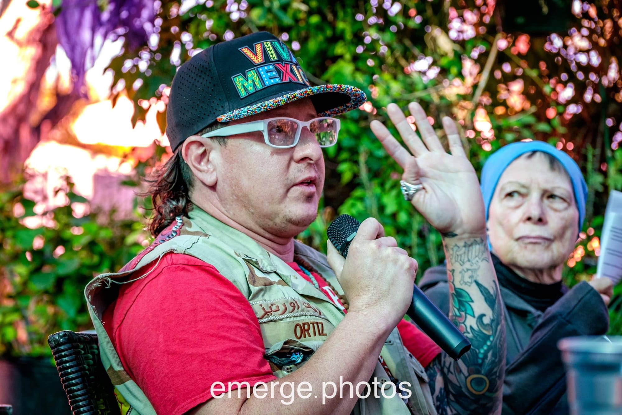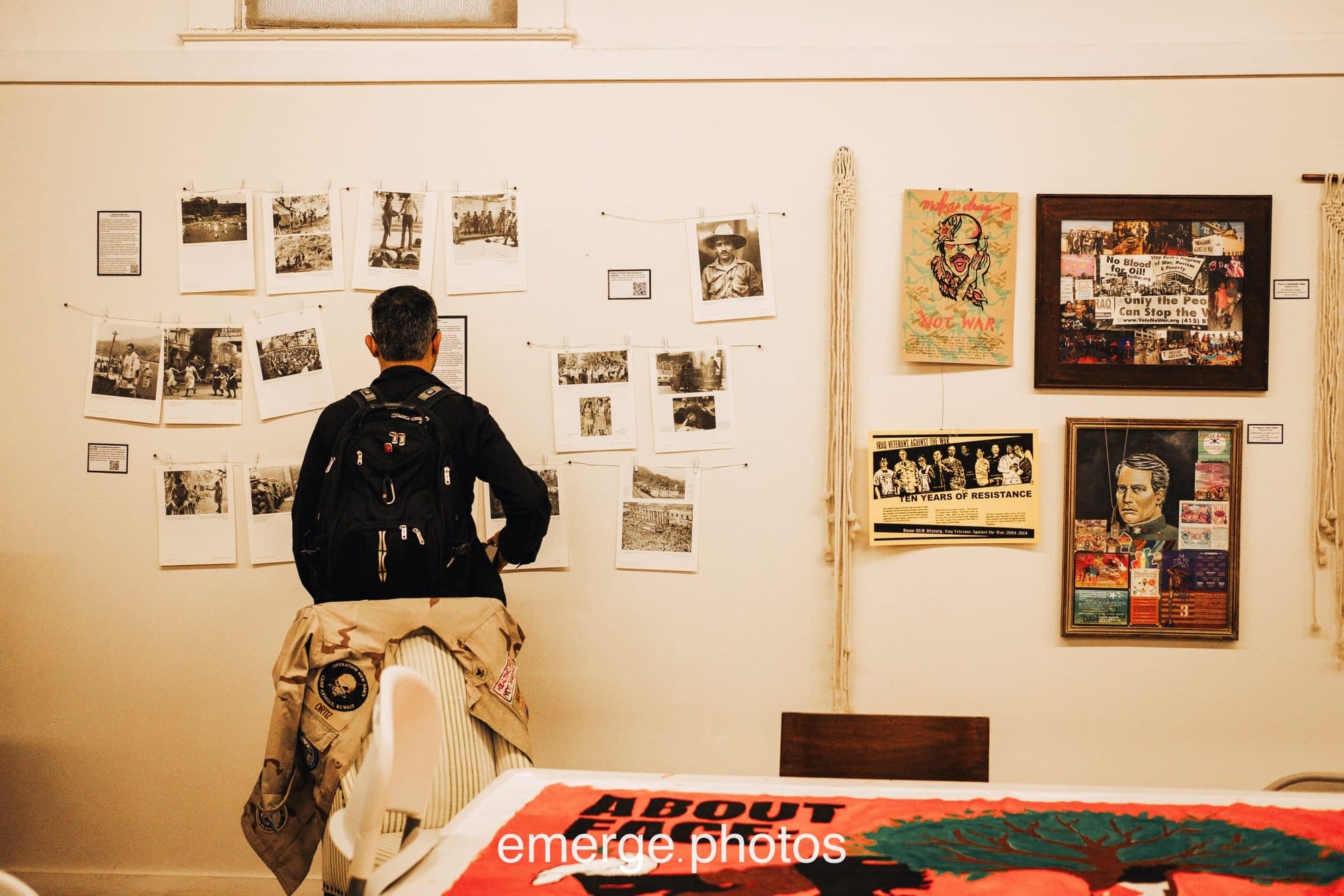 Leading up to Veteran’s Day on November 11, 2025, the local chapter of ABOUT FACE: Veterans Against the War organized a weekend of activities—live music, a family day, a drag story hour, a fire ritual, and a community panel and discussion—as part of “Veterans Voce,” a gallery exhibit held on San Antonio’s Southside.