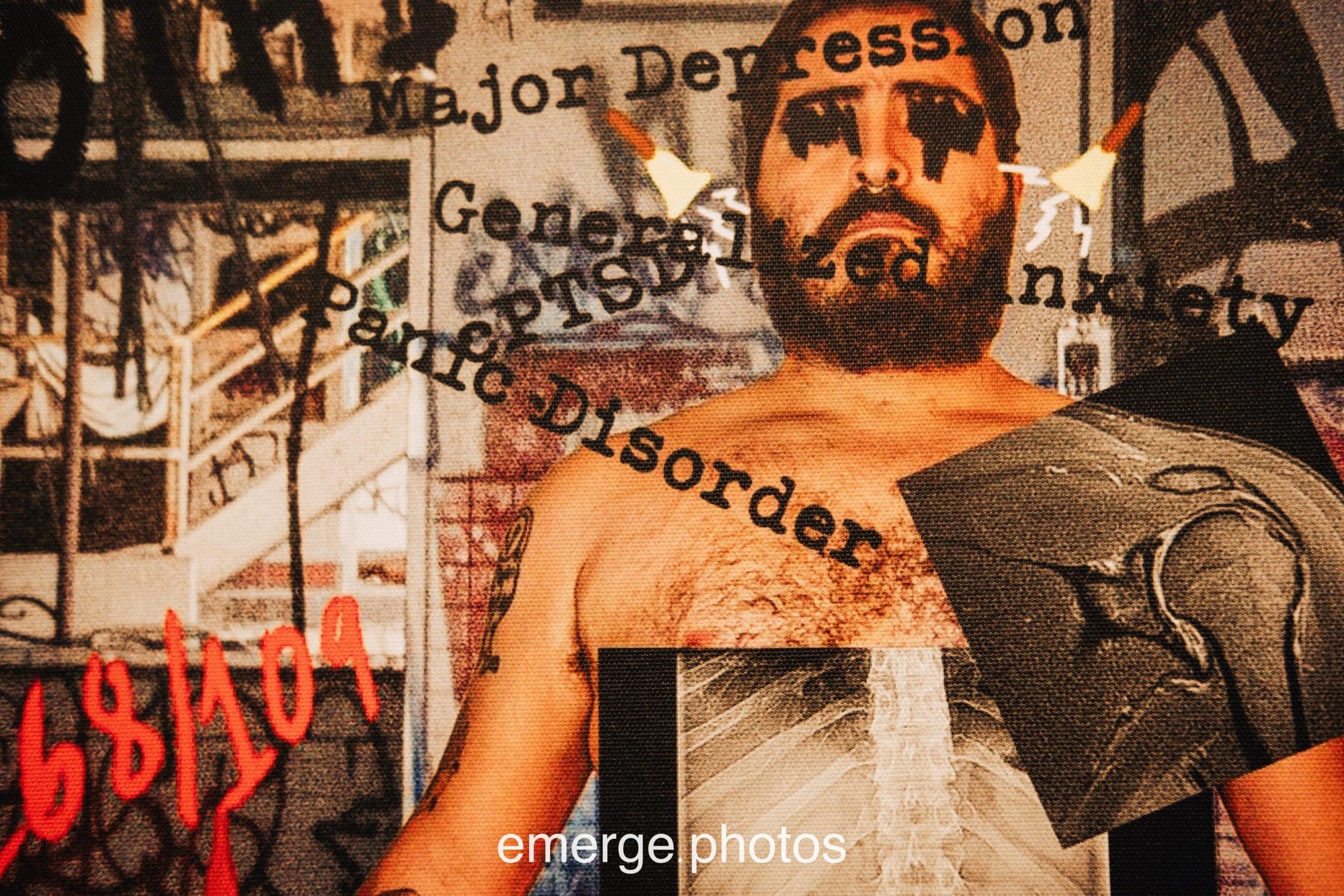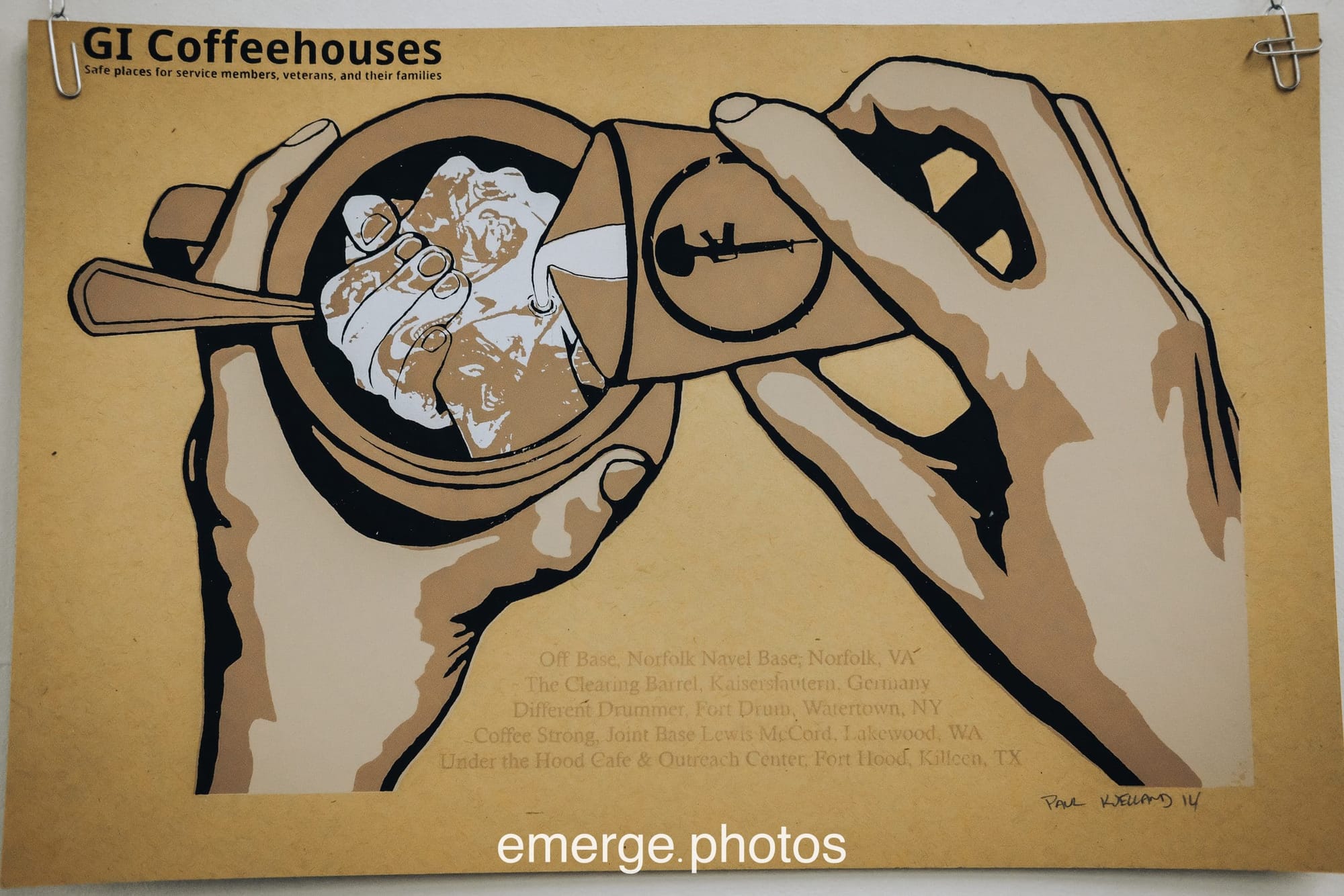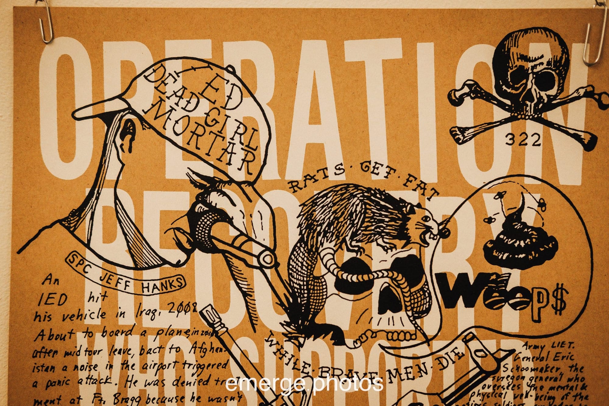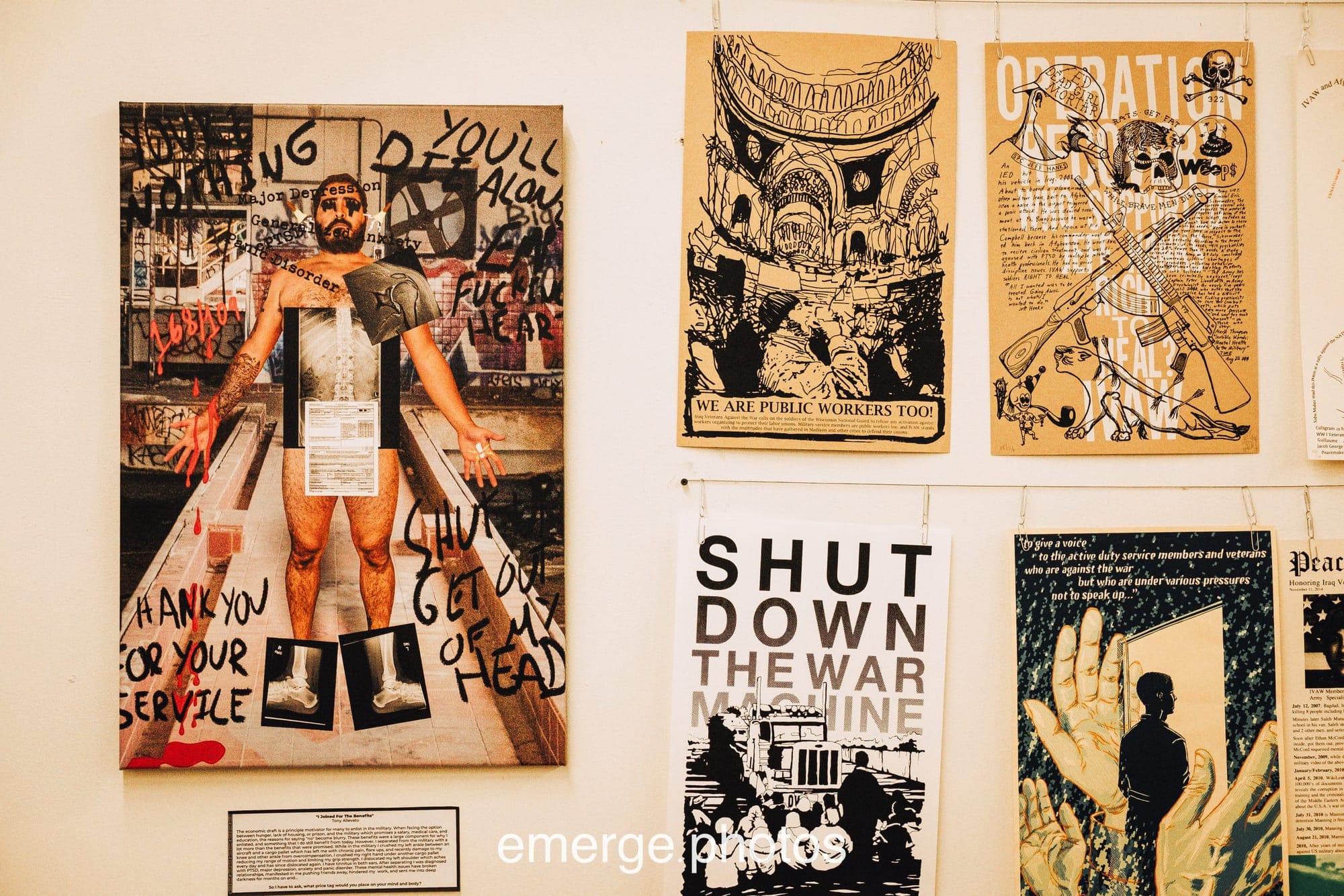 Featured image from landing page and captured in first image in the exhibit slide show above: ‘I Joined for the Benefits,’ by Tony Allevato, describes how the “economic draft” serves as a primary recruitment tool for many who face futures threatened by hunger, lack of housing, and prison.