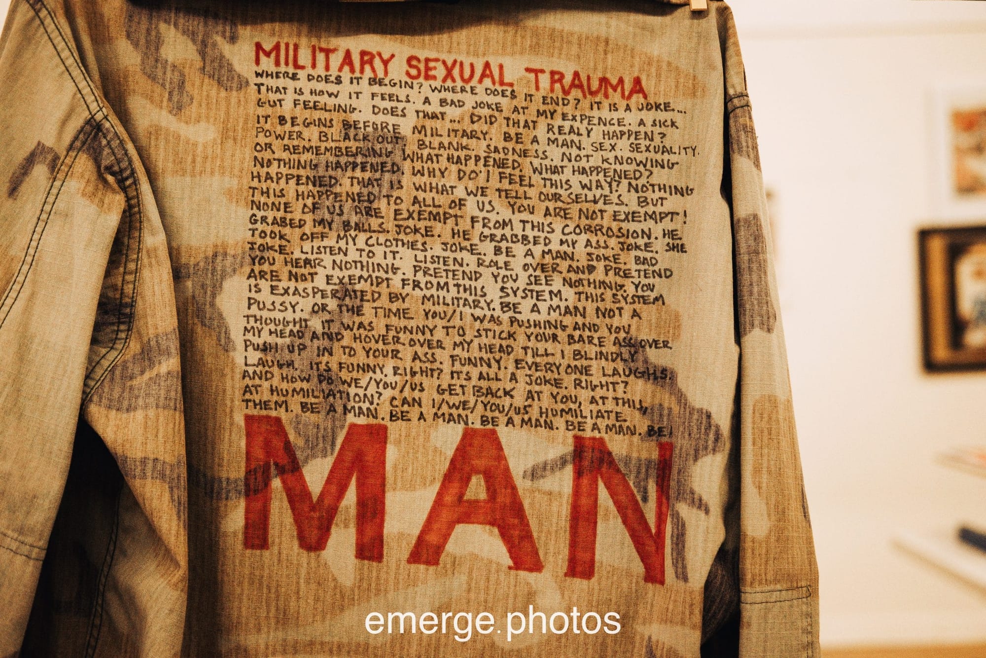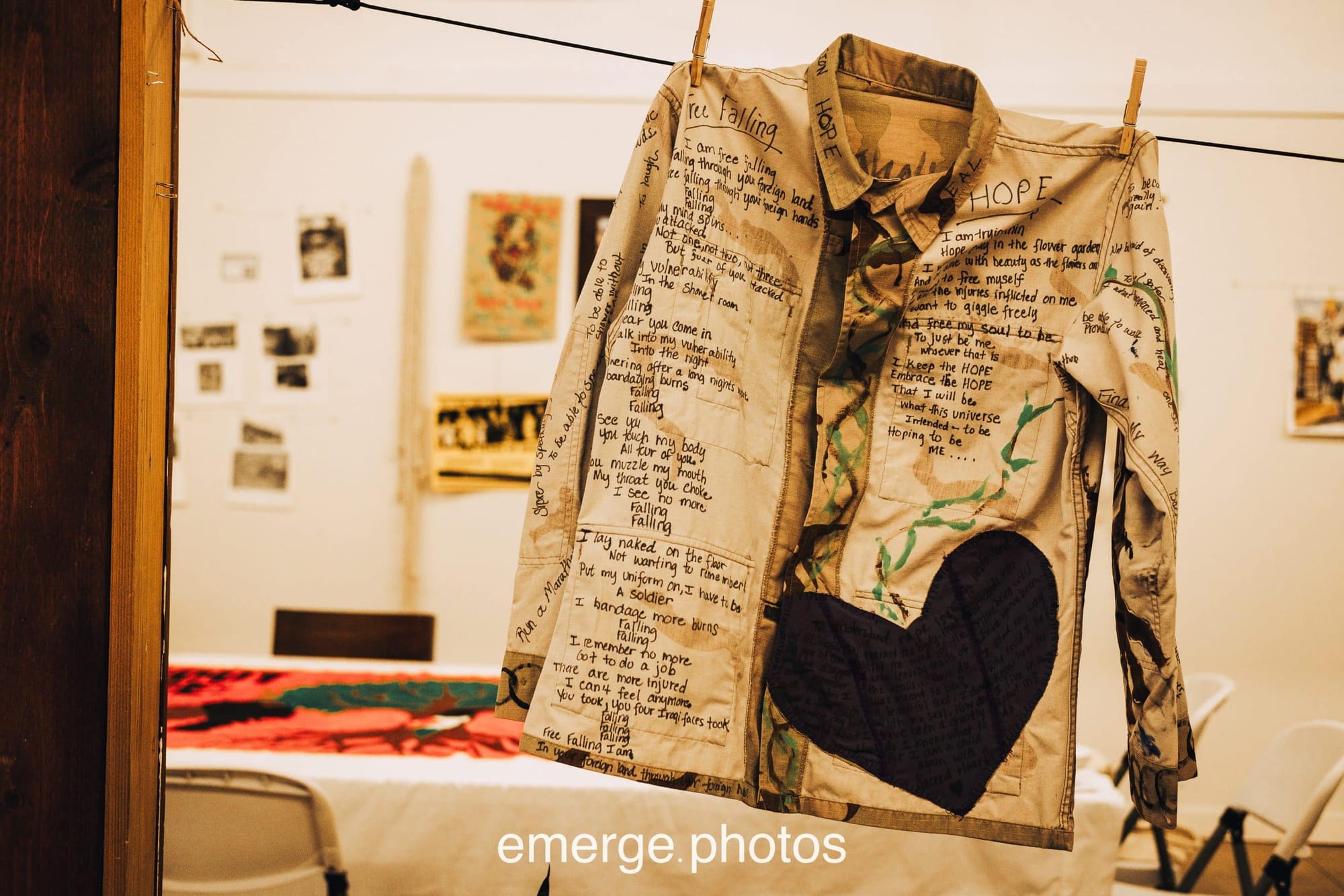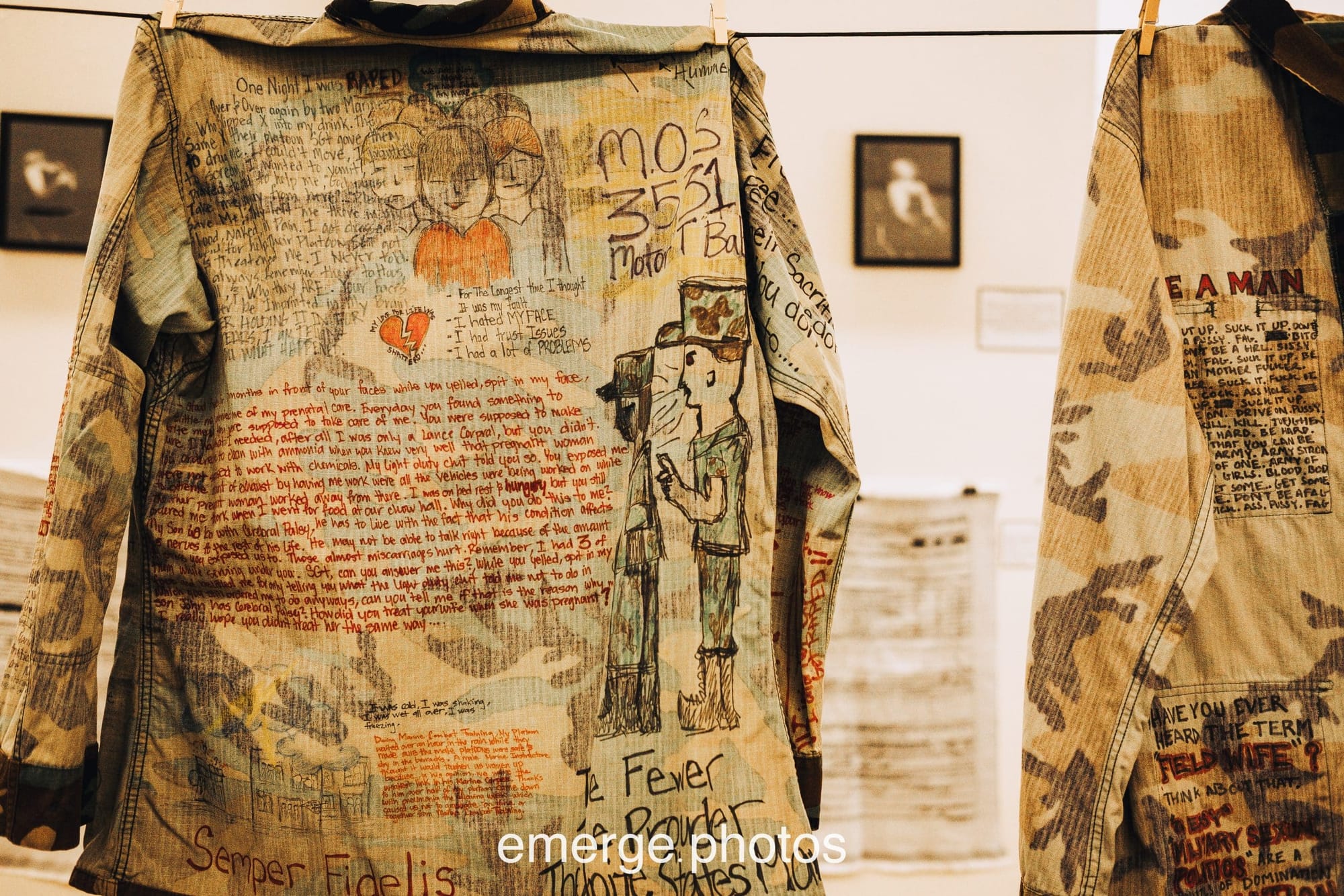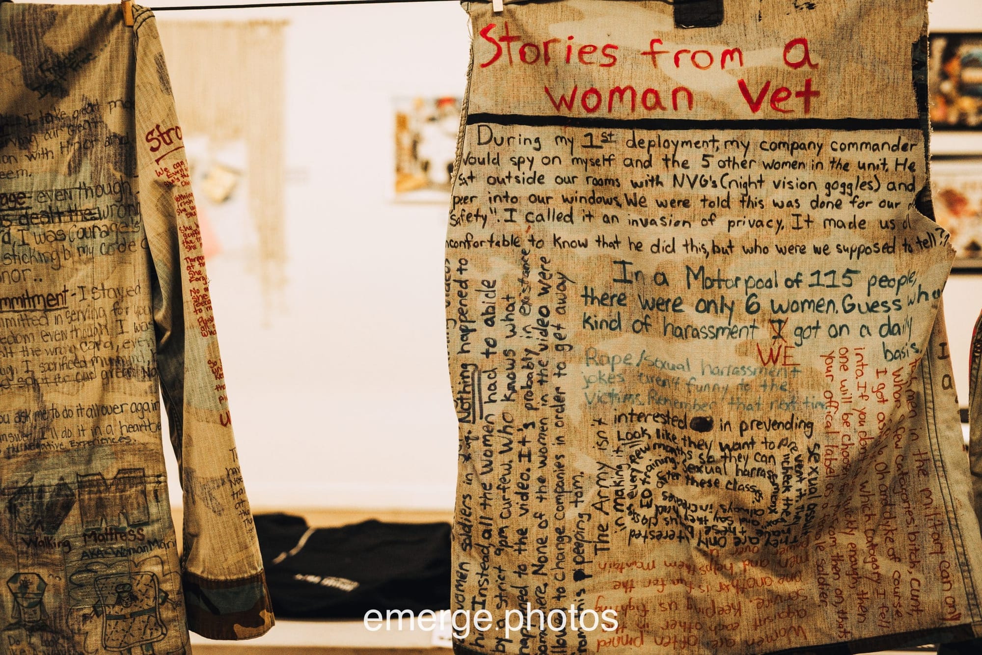 Though the exhibit itself has now closed, you can view photos here which capture some of the power of these pieces by veteran artists, some local to “Military City, USA” and some visiting from points around the country. Many of them are reflections on the abuse or assault suffered during military service; one of the most haunting of these is Regina Nelson’s “Fatigues Clothesline,” which features testimonio representing thousands of military sexual assault survivors scrawled on hanging garments.