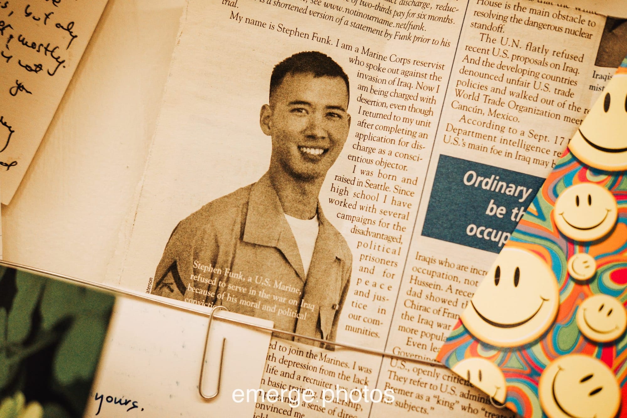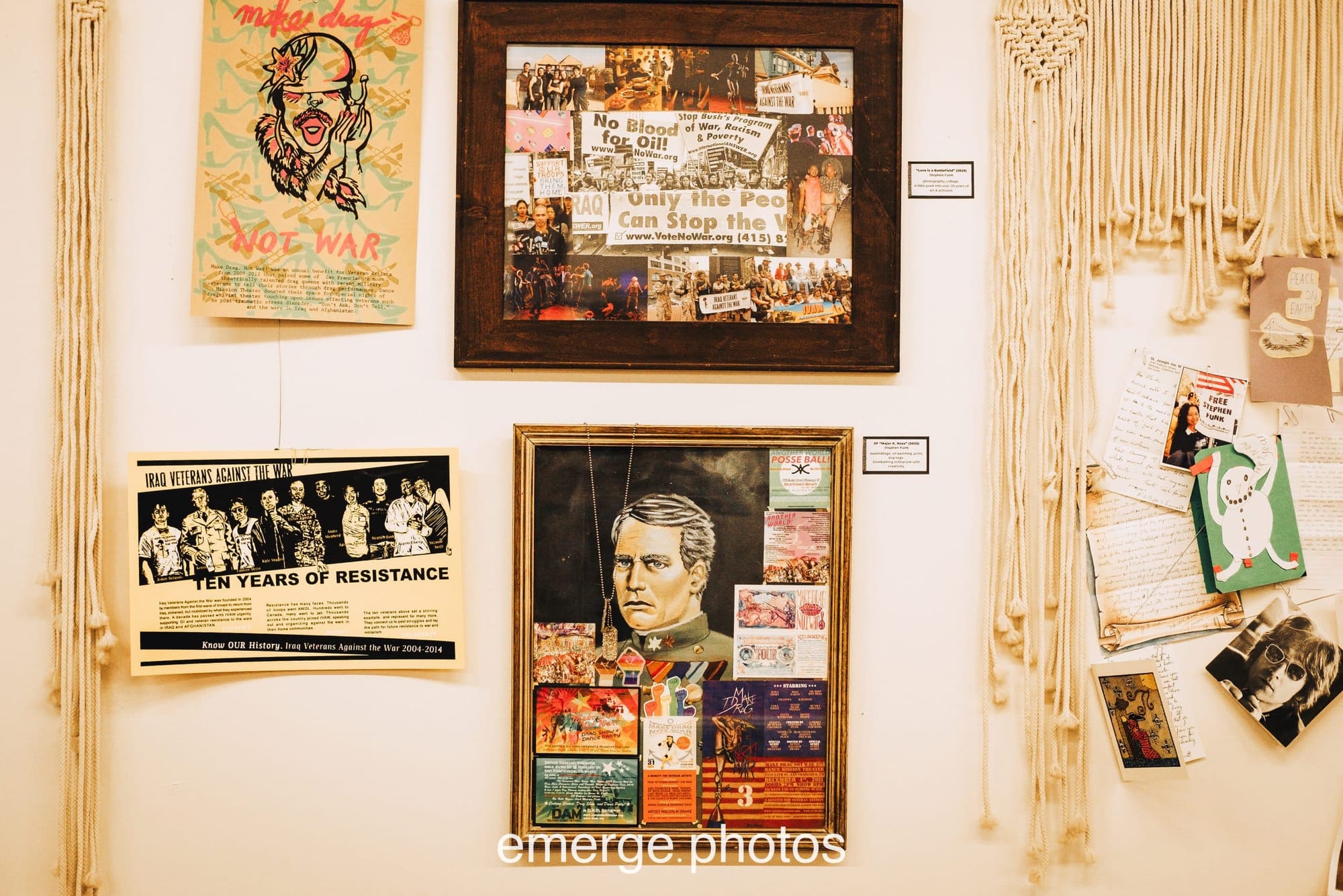 Other artists visiting San Antonio with the exhibit reflected on their experience as conscientious objectors. A former Marine from the Bay Area, Stephen Funk refused to participate in the invasion of Iraq and as a result was imprisoned for six months; “Letters from the Brig” displays the many notes and photographs he received from around the world during his time as a political prisoner.