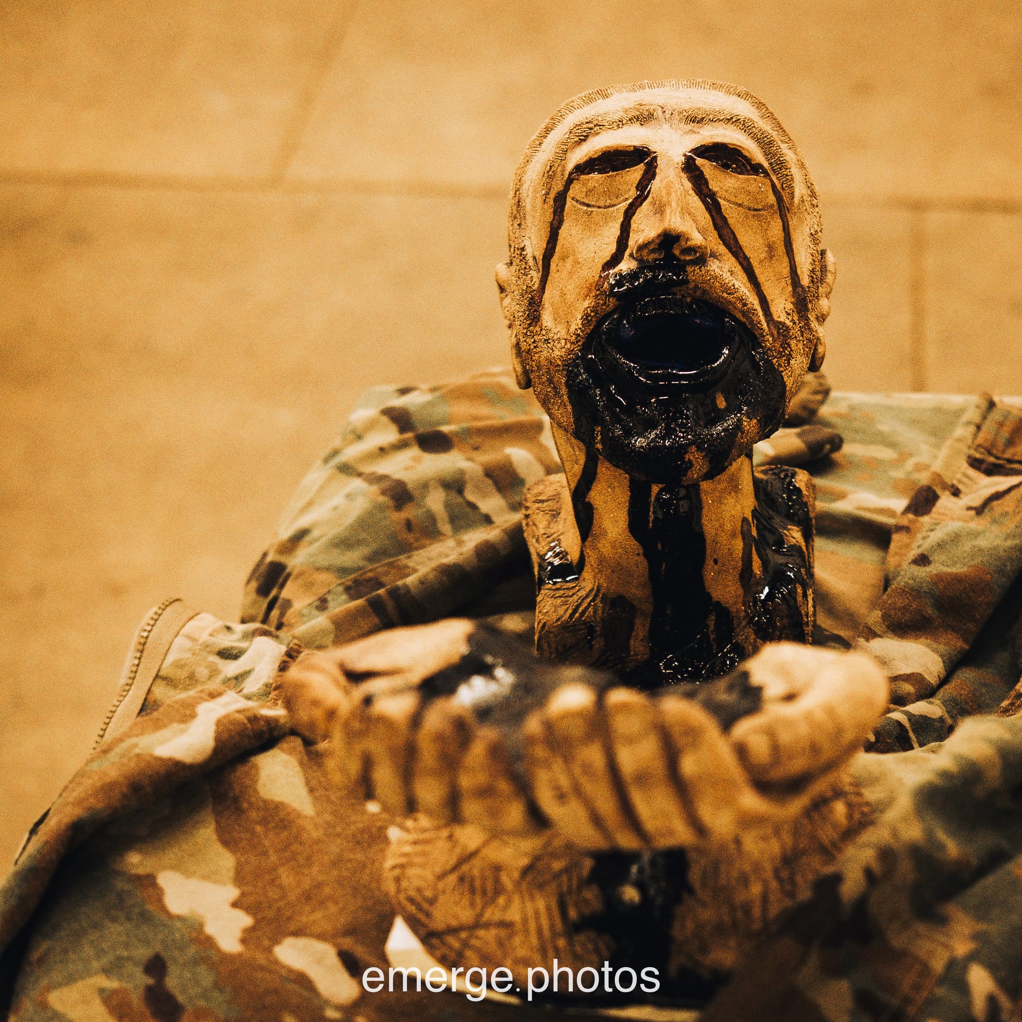 Much of the power of “Veterans Voce,” though, lies in its unflinching reflection on and transformation of the moral injuries that attend participation in war against other peoples, or the imperialist invasion and occupation of other lands. On entry to the exhibit, I was immediately arrested by “Glutton,” a sculpture by Tony Allevato that features a human head with open eyes and mouth streaming a darkness evocative of blood or oil.
