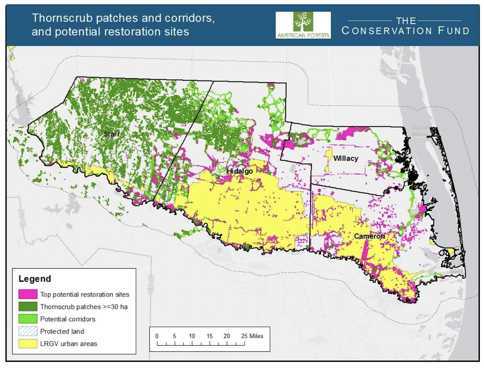 Two decades later, he’s still into it. He is a director at American Forests, which has toiled for 150 years to restore ecosystems nationwide. The nonprofit started working in the Rio Grande Valley in 1997 and took over the federal restoration effort last year. It also leads the Thornforest Conservation Partnership, a coalition of agencies and organizations hoping to restore at least 81,444 acres, the amount needed for the ocelot population to rebound. Although conservation remains the core mission, everyone involved understands, and promotes, the thorn forest’s ability to boost community resilience to the ravages of a warming world.
