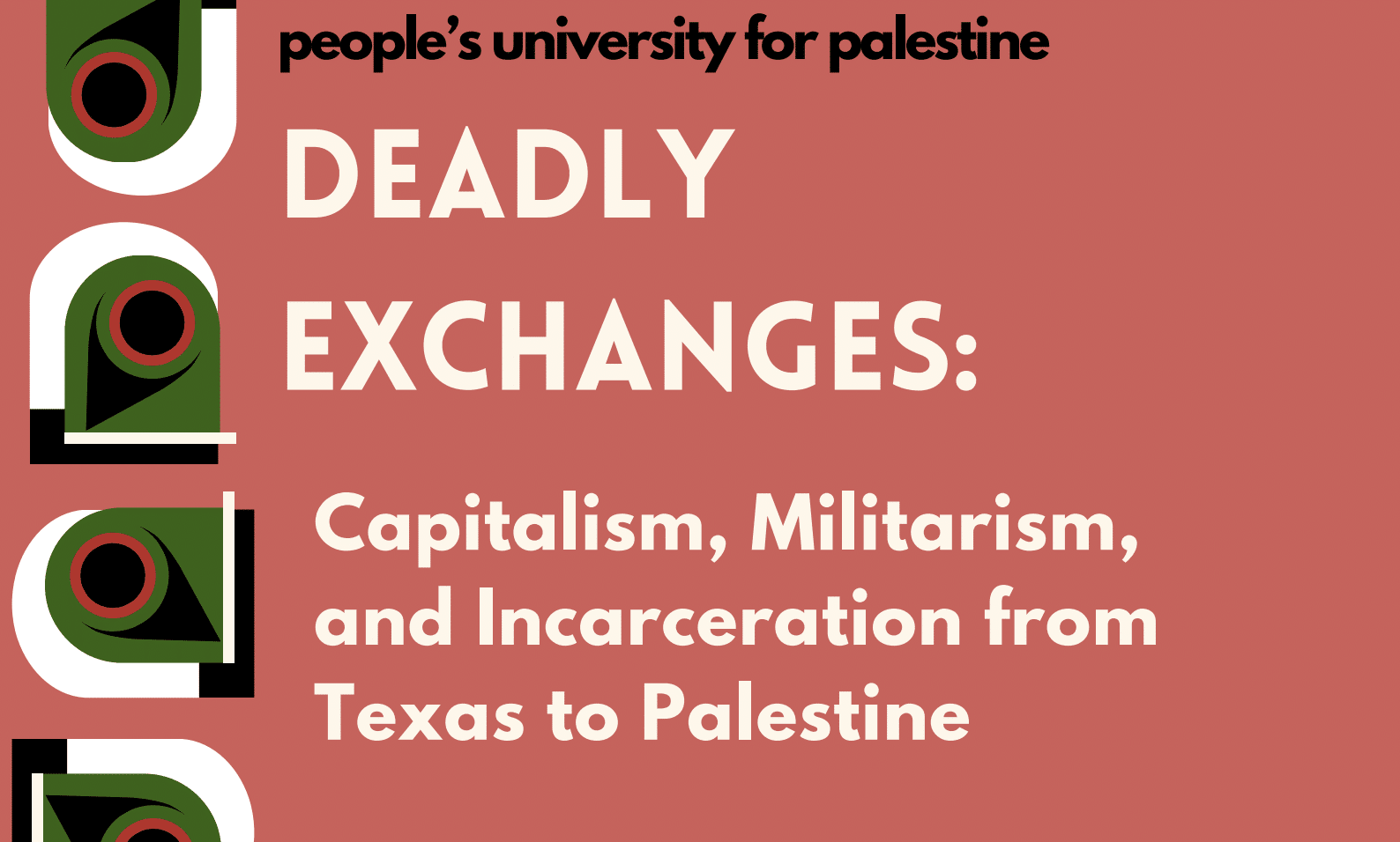People's University for Palestine Present: Deadly Exchanges: Capitalism, Militarism, and Incarceration from Texas to Palestine This is the third event in an ongoing series. See video of past events here. Register by scanning the QR code below.