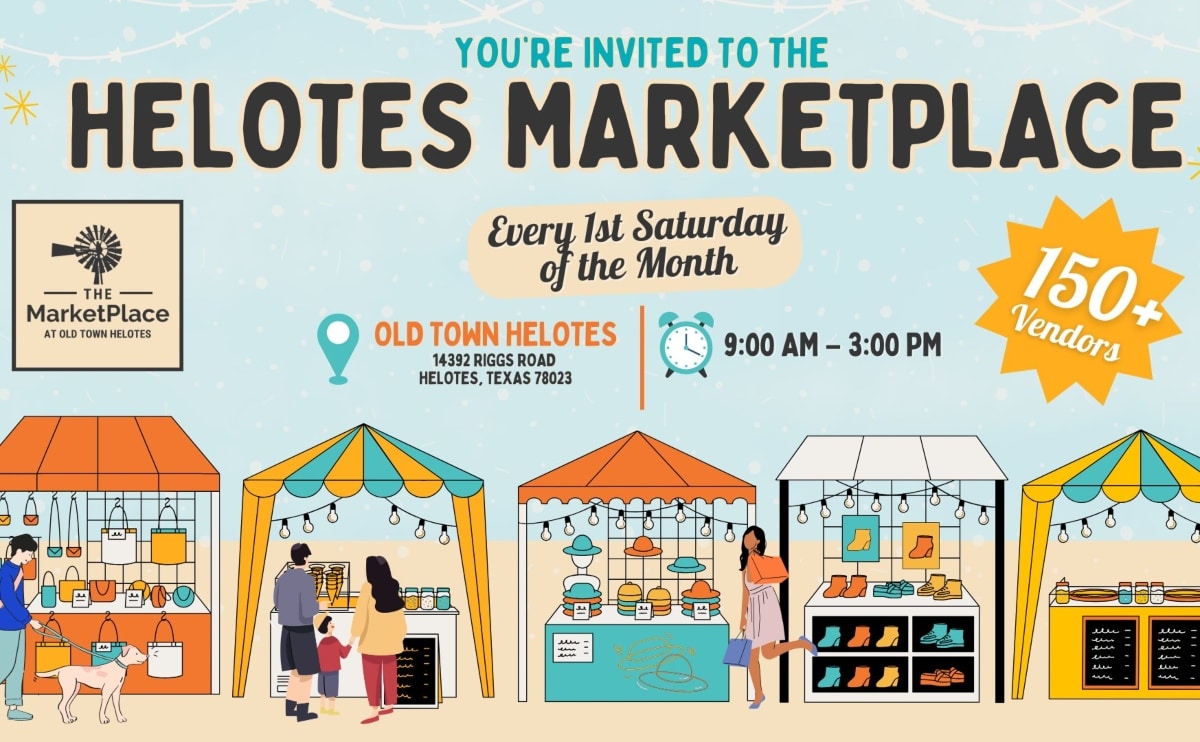 Join us at Old Town Helotes every 1st Saturday of the month from 9:00 AM to 3:00 PM for the Helotes Marketplace!  Located at 14392 Riggs Road, Helotes, TX 78023. Enjoy delicious cuisines, shop unique crafts, and discover something exciting every time. We can’t wait to see you there!