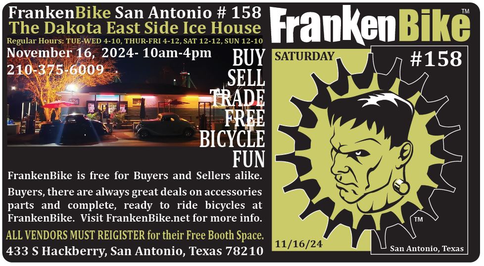FrankenBike San Antonio #158 - Presented by BikeTexas, Independence Brewing Company, Ruta Maya Coffee and Club Sirius - will be held on Saturday, November 16, 2024 from 10am-4pm at The Dakota East Side Ice House located at 433 S Hackberry, San Antonio, Texas 78203. No Outside Food or Adult Beverages. https://thedakotasa.comhttp://biketexas.orghttp://independencebrewing.comhttp://drinksirius.comhttp://rutamaya.net FrankenBike is free for […]