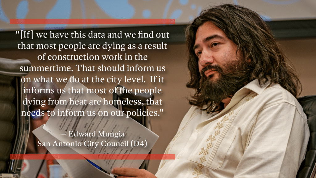 “It’s a small ask that people have to keep track of the number of people that have died,” Mungia said. “I think it can inform us on other things, right? We have this data and we find out that most people are dying as a result of construction work in the summertime, that should inform us on what we do at the city level, right? If it informs us that most of the people dying from heat are homeless, that needs to inform us on our policies.