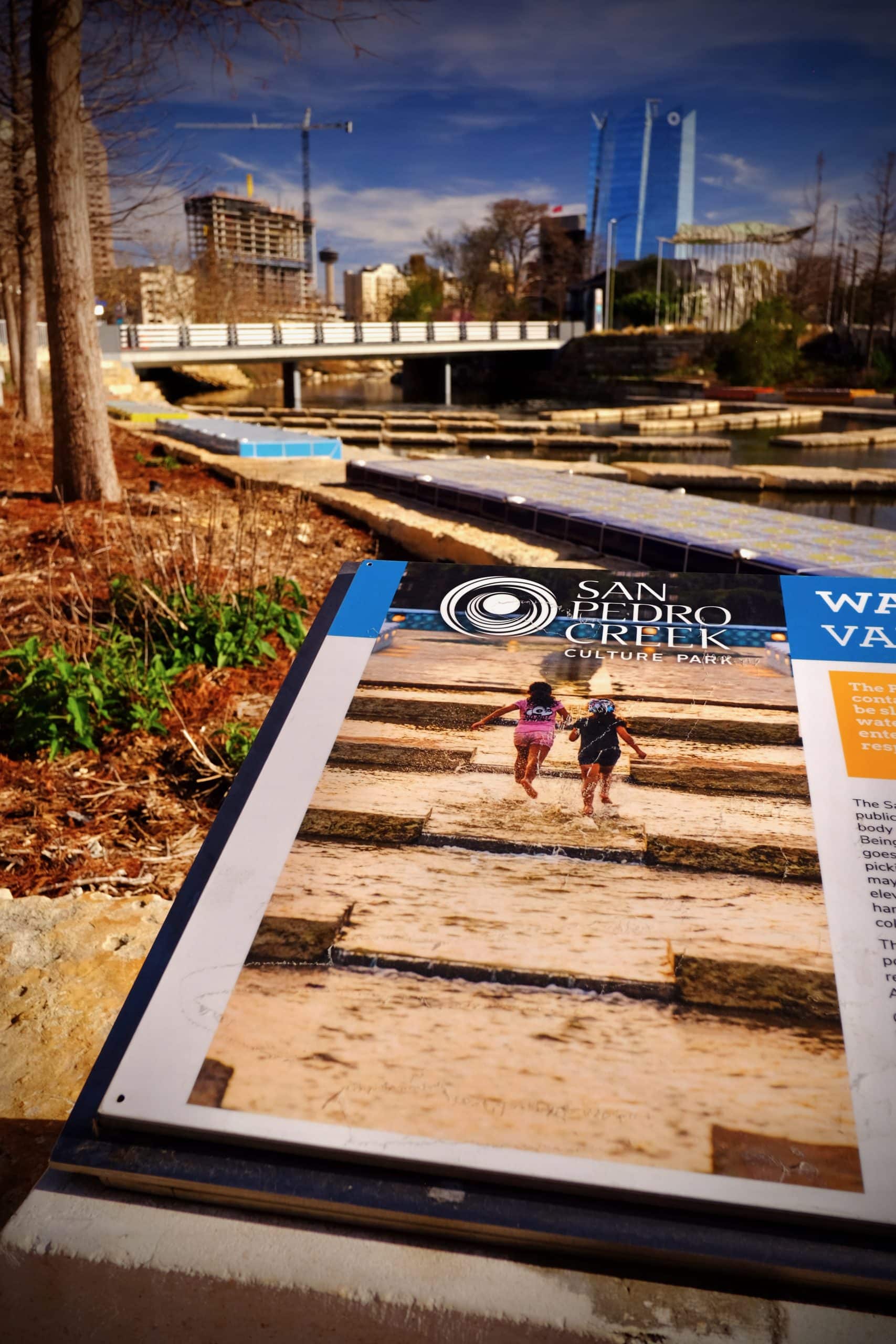 In the shadows of a stacked I-10 interchange on the western edge of downtown there is no teeming rookery. Avian contribution to water E. coli levels here is believed by SARA to be minimal. A towering metal sculpture releases a steady sheet of recirculated creek water into a natural aquatic playscape.