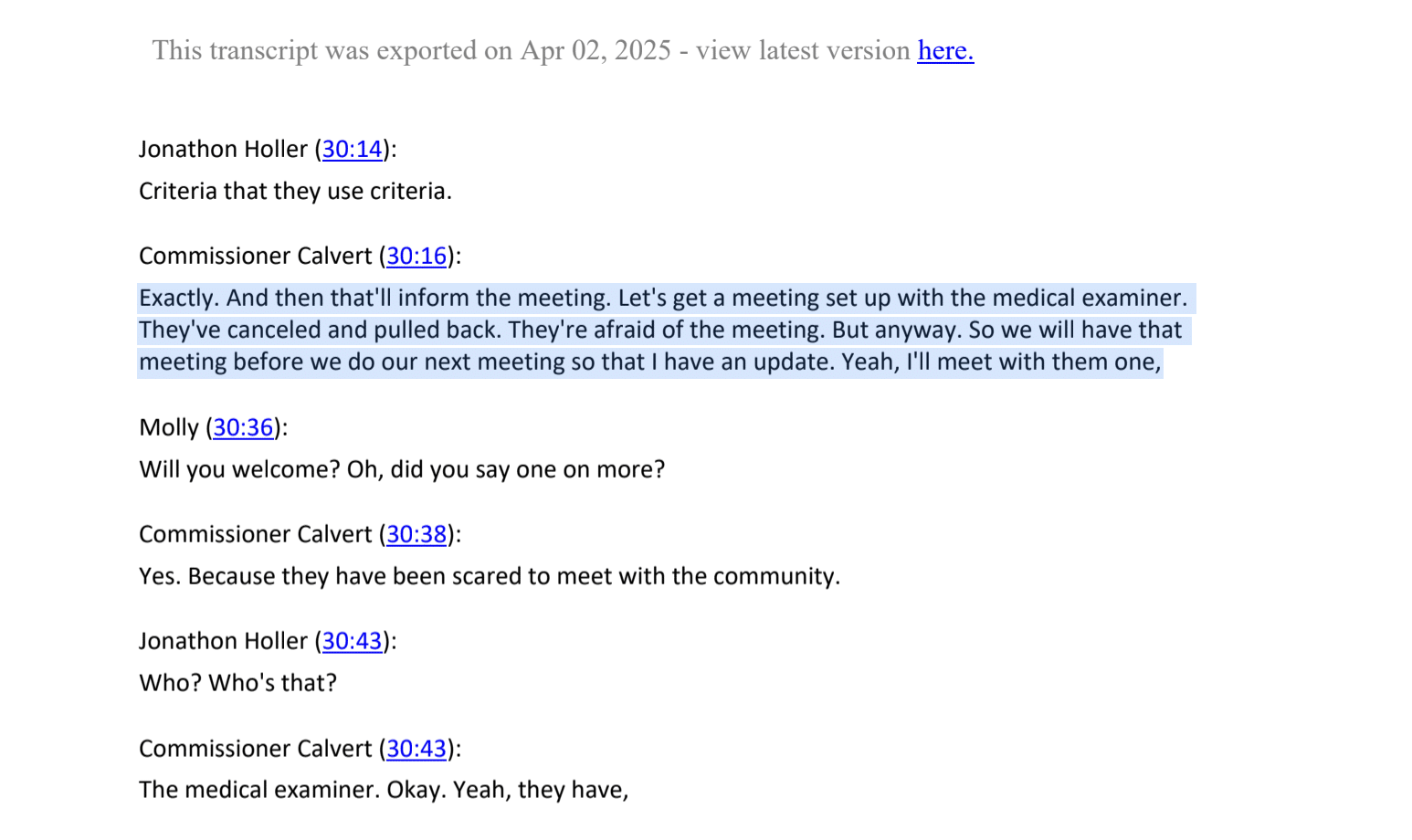 An AI-generated transcript documenting a recent meeting between advocates for the unhoused community and the office of Bexar County Commissioner Tommy Calvert shared with Deceleration shows Calvert is pursuing a private meeting with the medical examiner in order to update the group on their questions about heat tracking. The transcript notes that the medical examiner has been been “scared to meet with the community.”