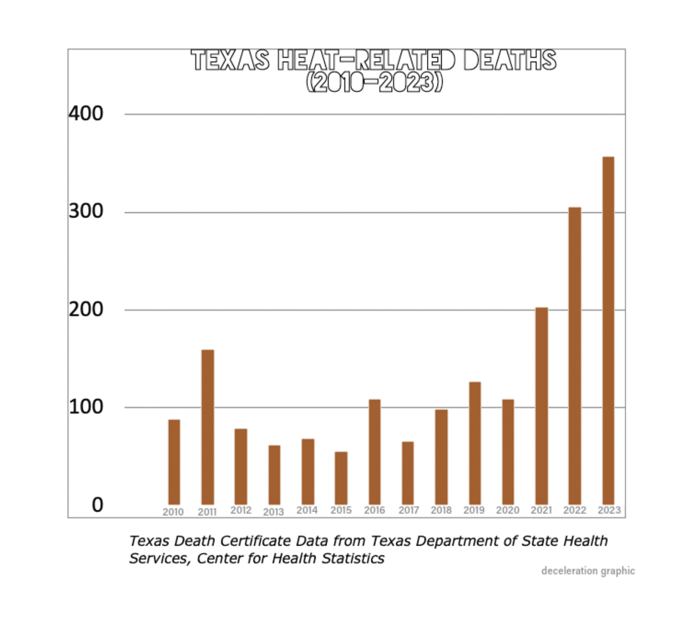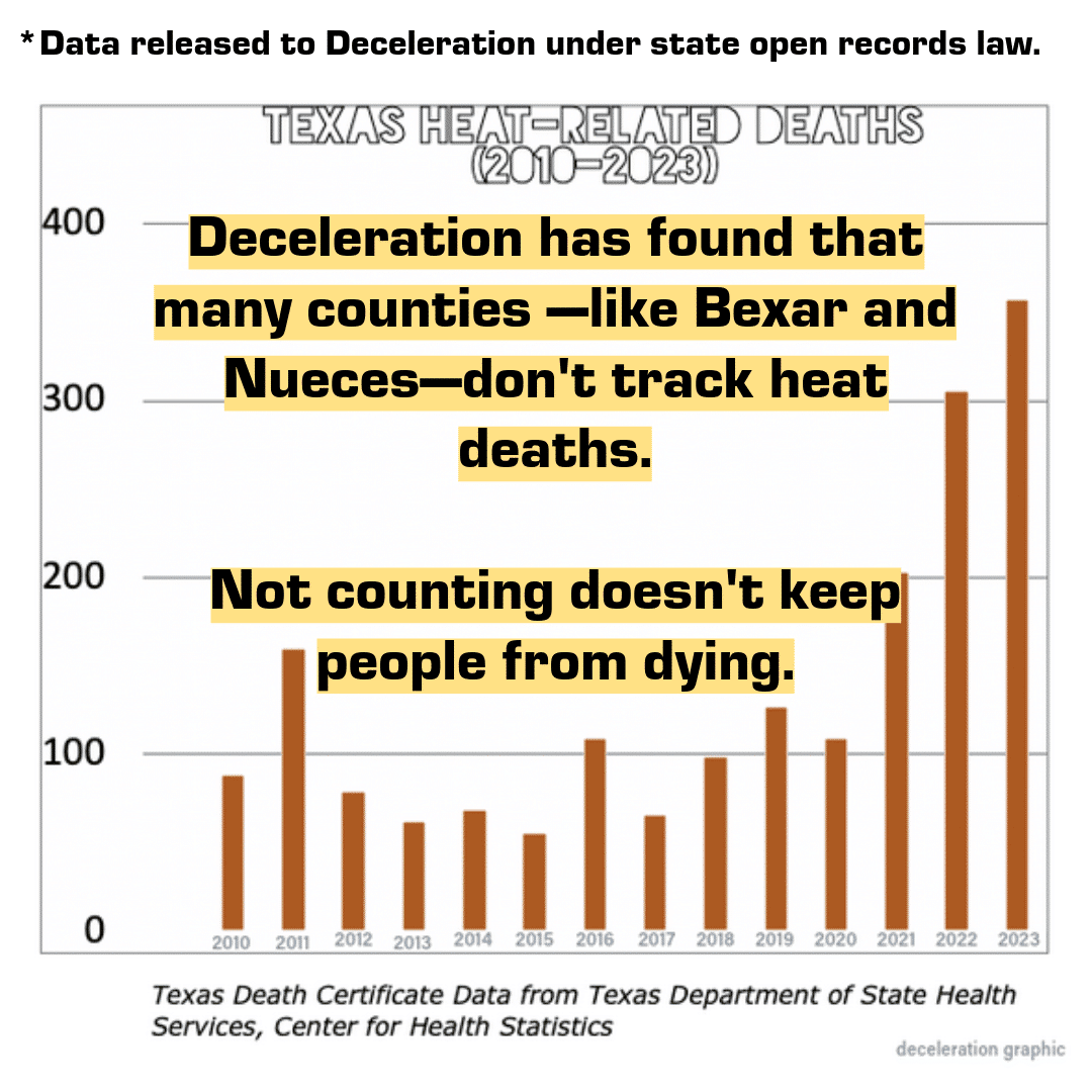 Extreme heat claimed the lives of more than 350 people across Texas last year, according to data provided to Deceleration in April by the Texas Department of State Health Services, Center for Health Statistics. This figure is almost certainly an undercount as many counties in the state—including Bexar and Nueces—don’t track heat deaths.