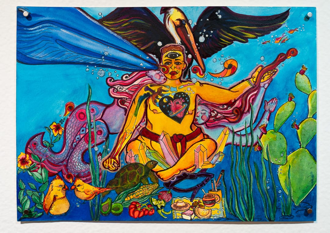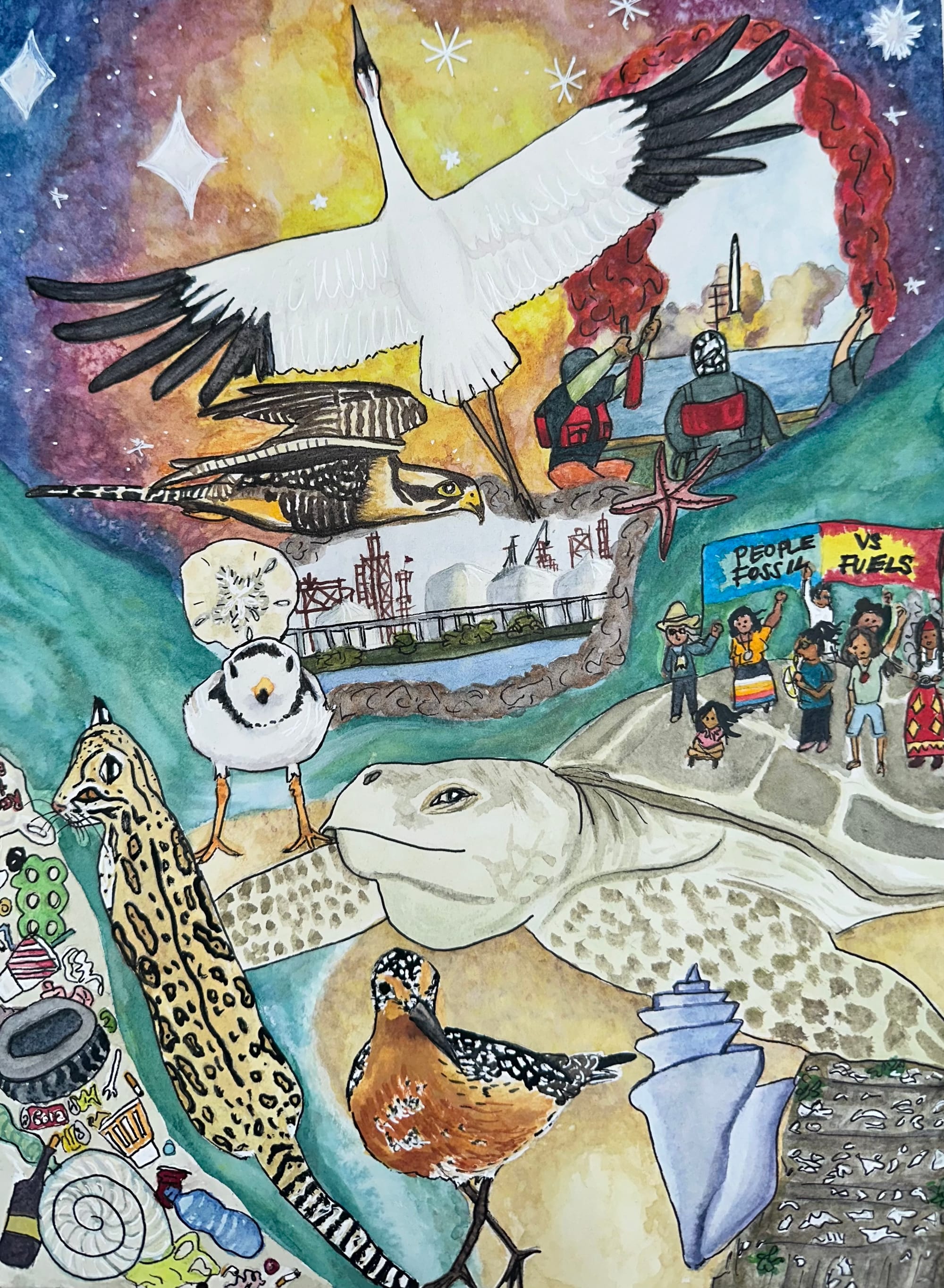 And yet the art and writing here burst with the colors of the many lives we continue to cherish and fight for—a “sea of creatures,” to borrow from the title of paleoartist Seth Anson’s image above. Like the pockets of biodiversity still held by “refugia”—or places more protected from climate impacts where coral have persisted—these poems and paintings contain the seeds for recovery we will need for a world yet to come, a world whose future is yet unwritten, a world we are still writing and fighting for.
