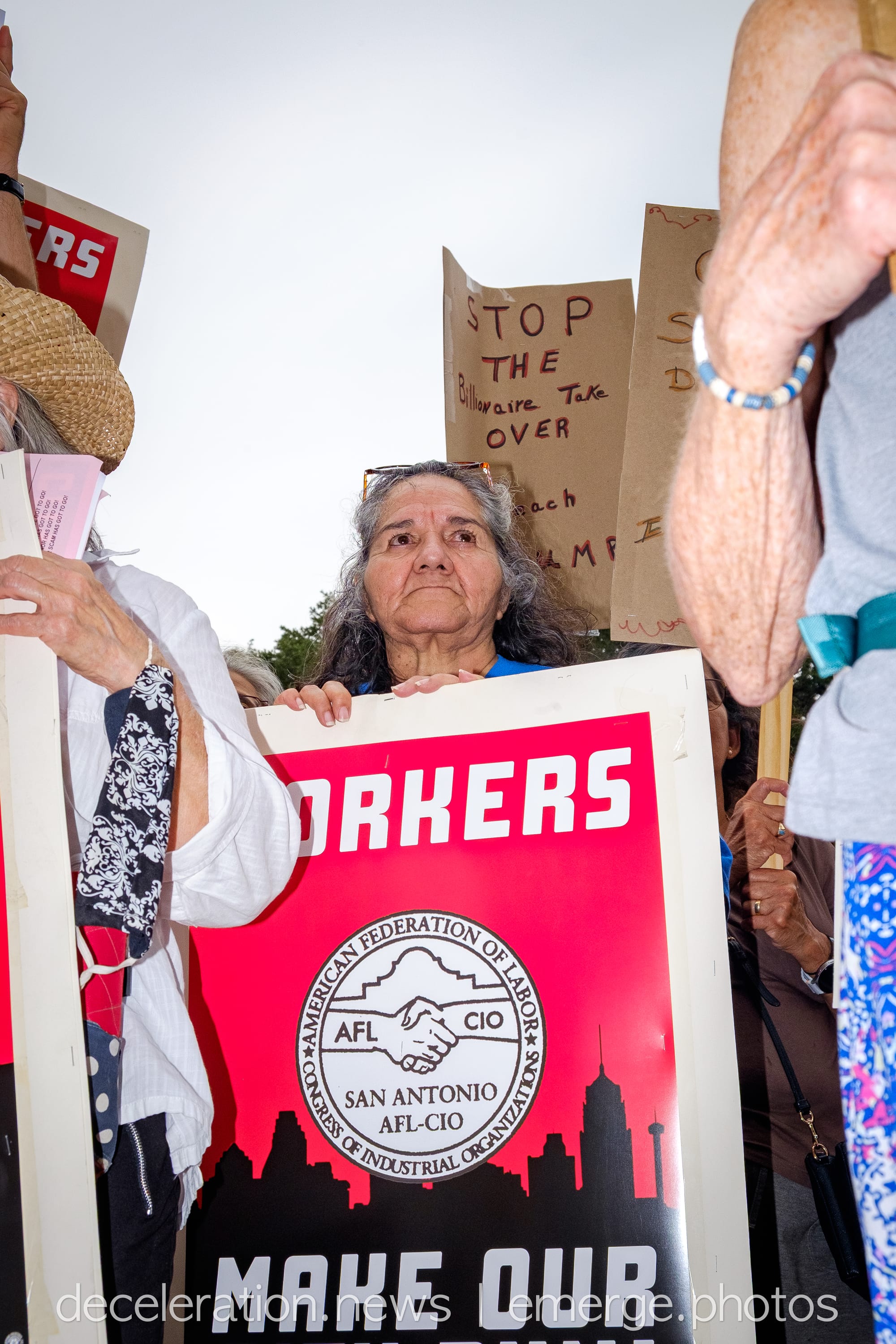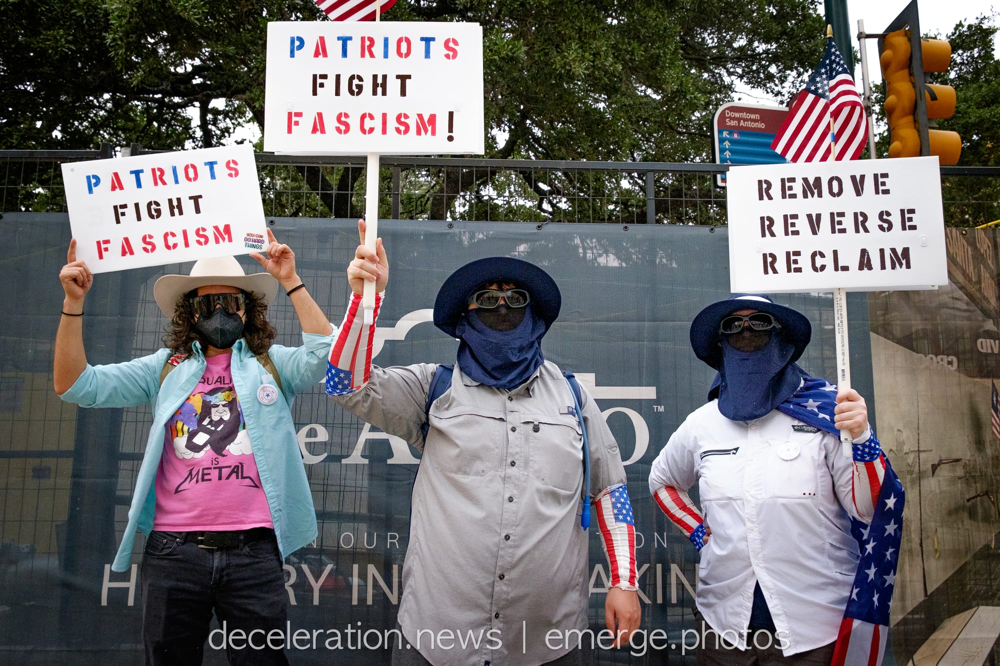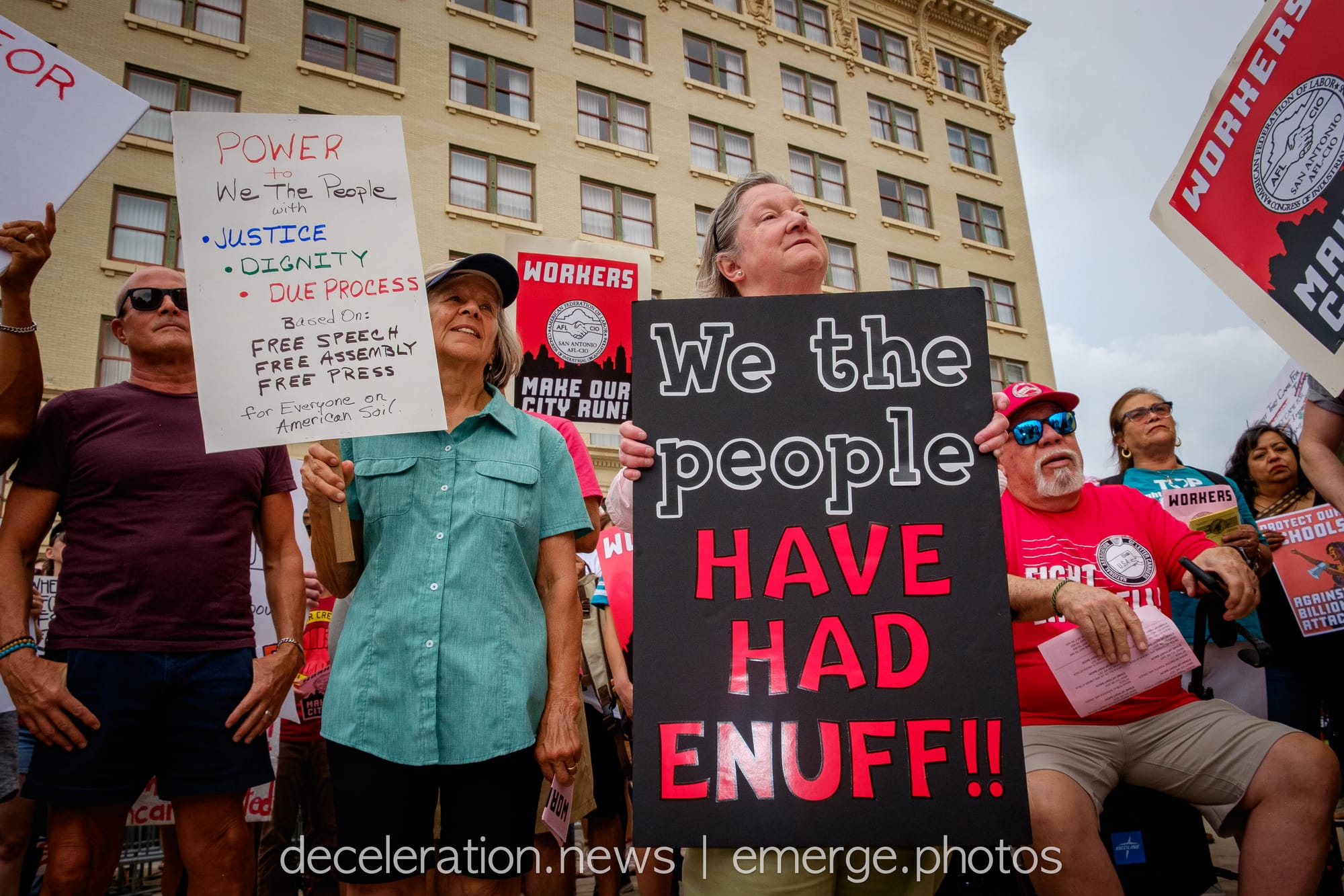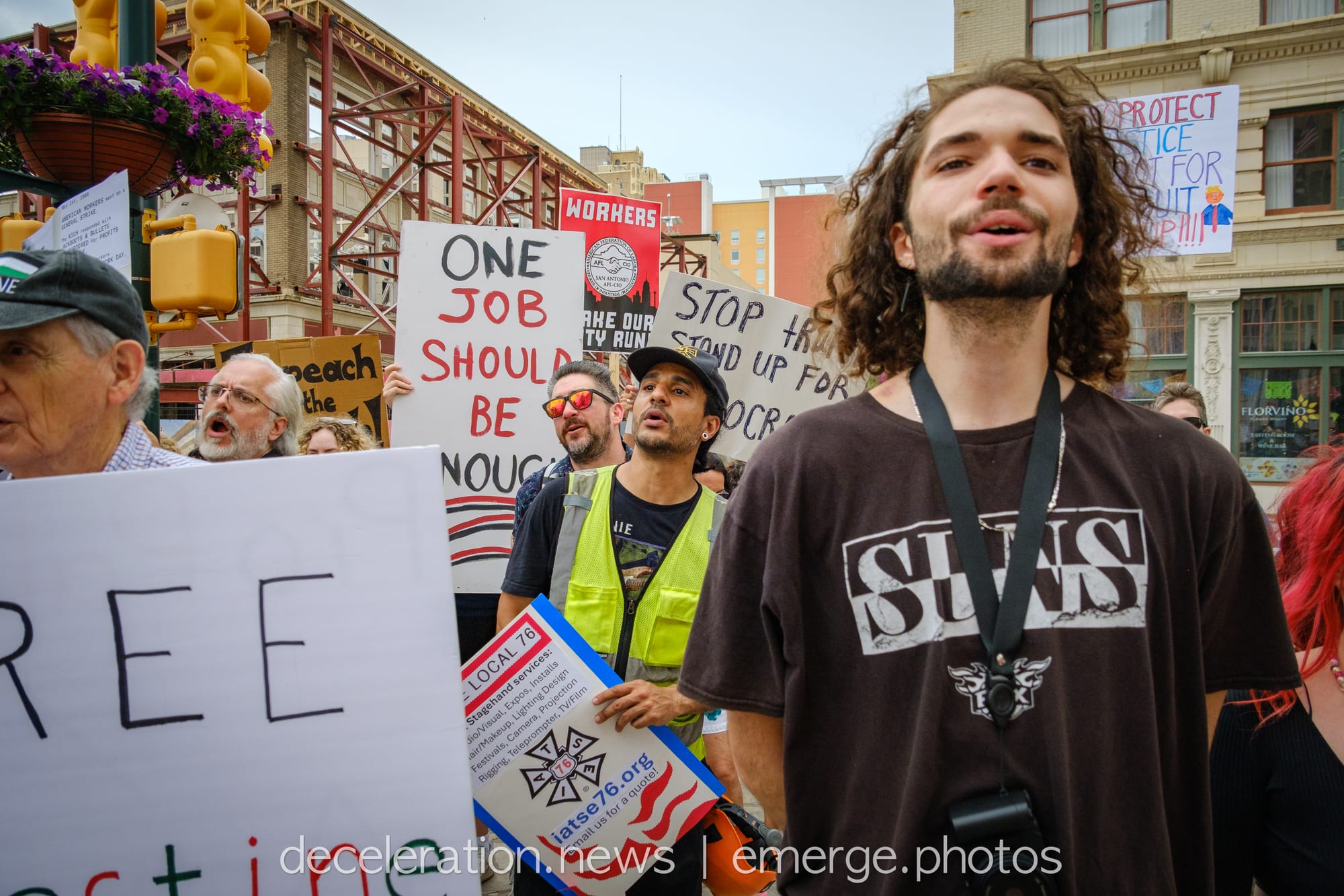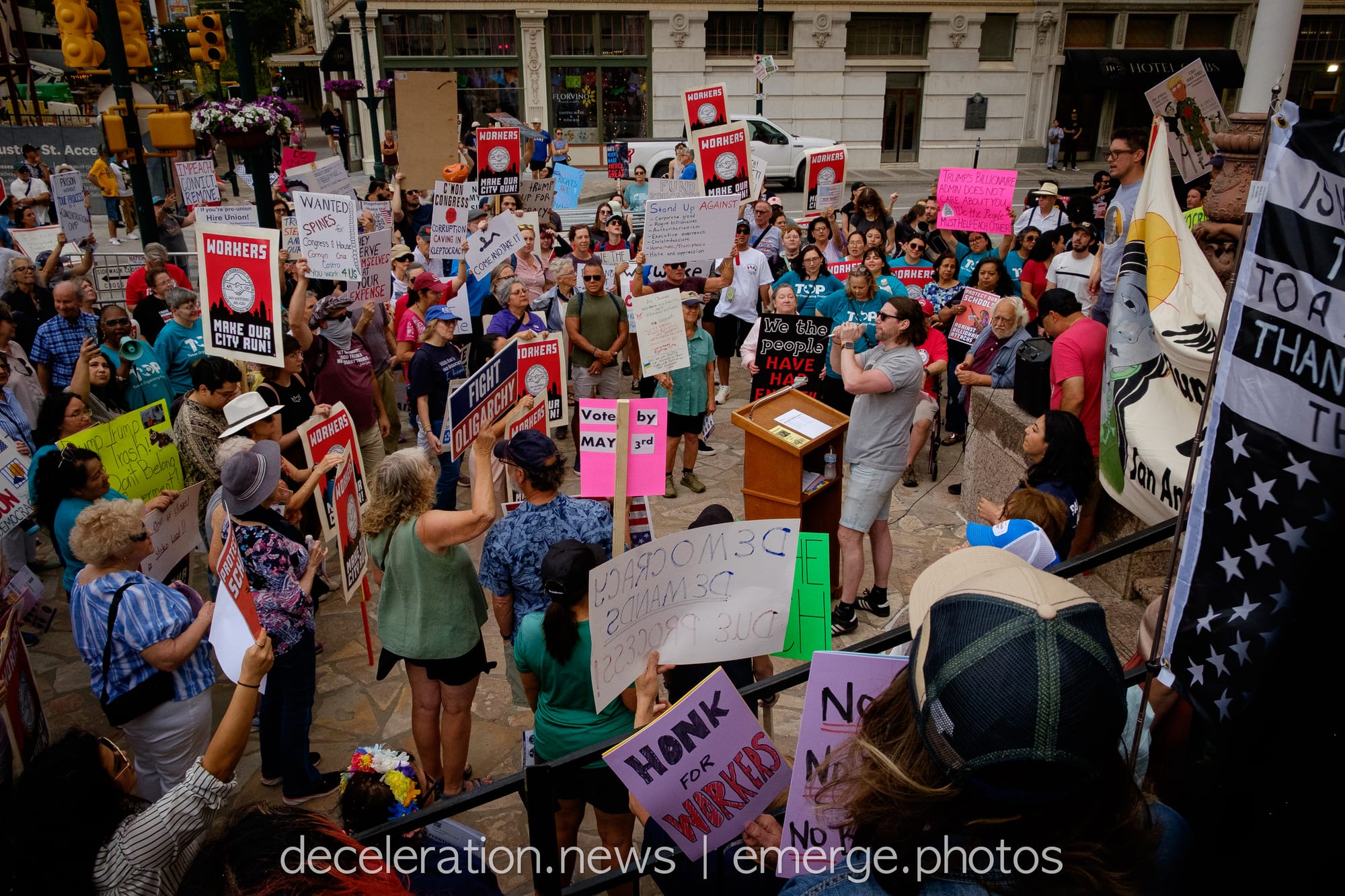 Later that day, between 200 and 300 area residents converged on a downtown federal building adjacent to the storied Alamo (described both as a “Shrine to Texas Liberty” and a “Shrine to White Supremacy“) as part of an ongoing international protests decrying the abuses of the Trump administration and its attacks on federal workers, social service programs, and human rights.