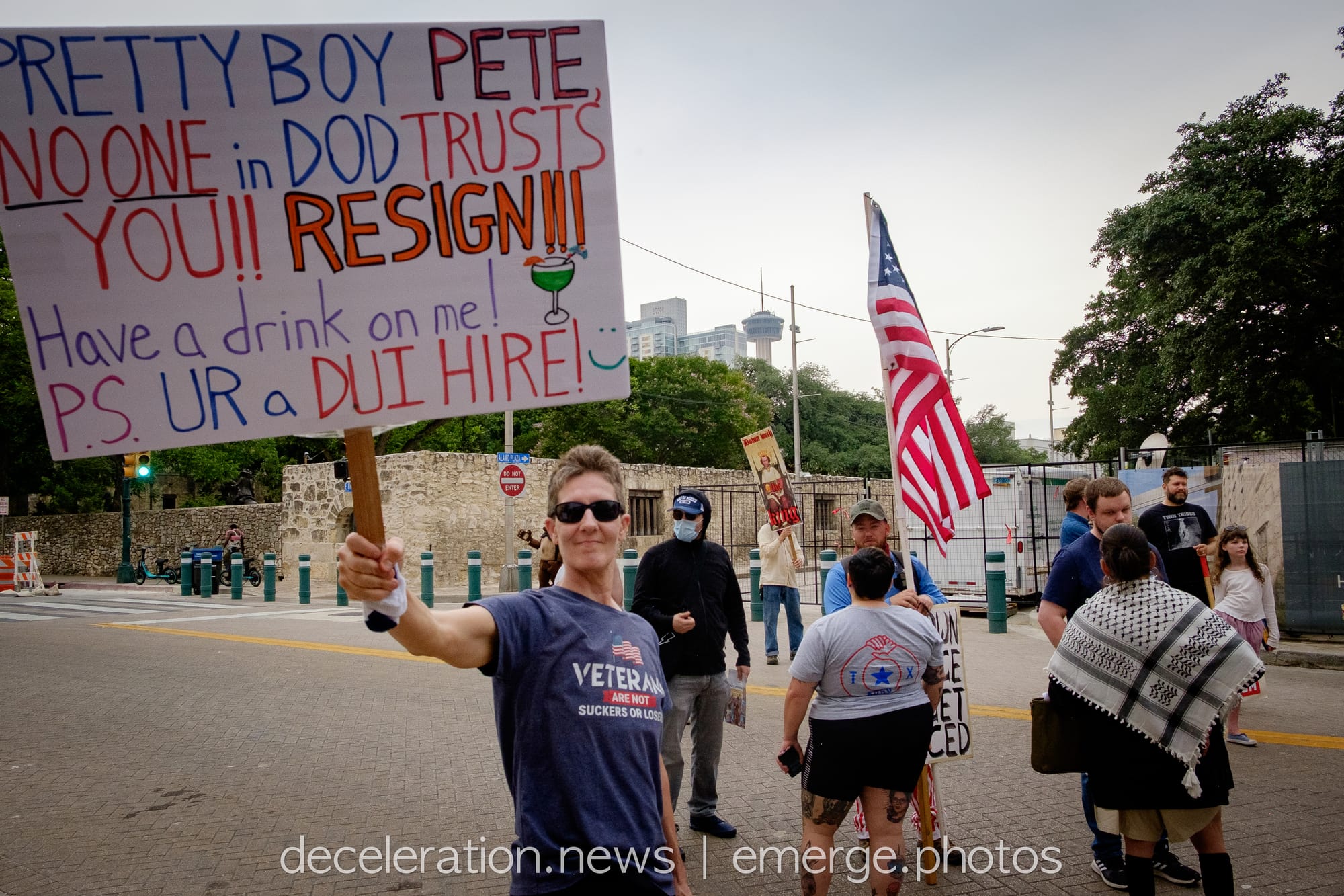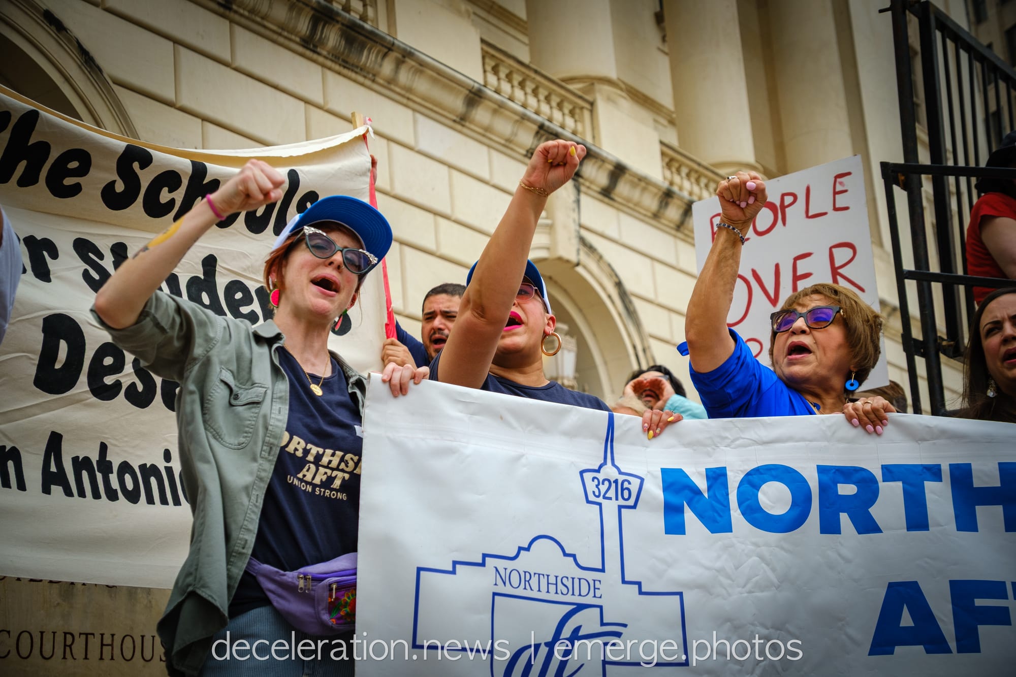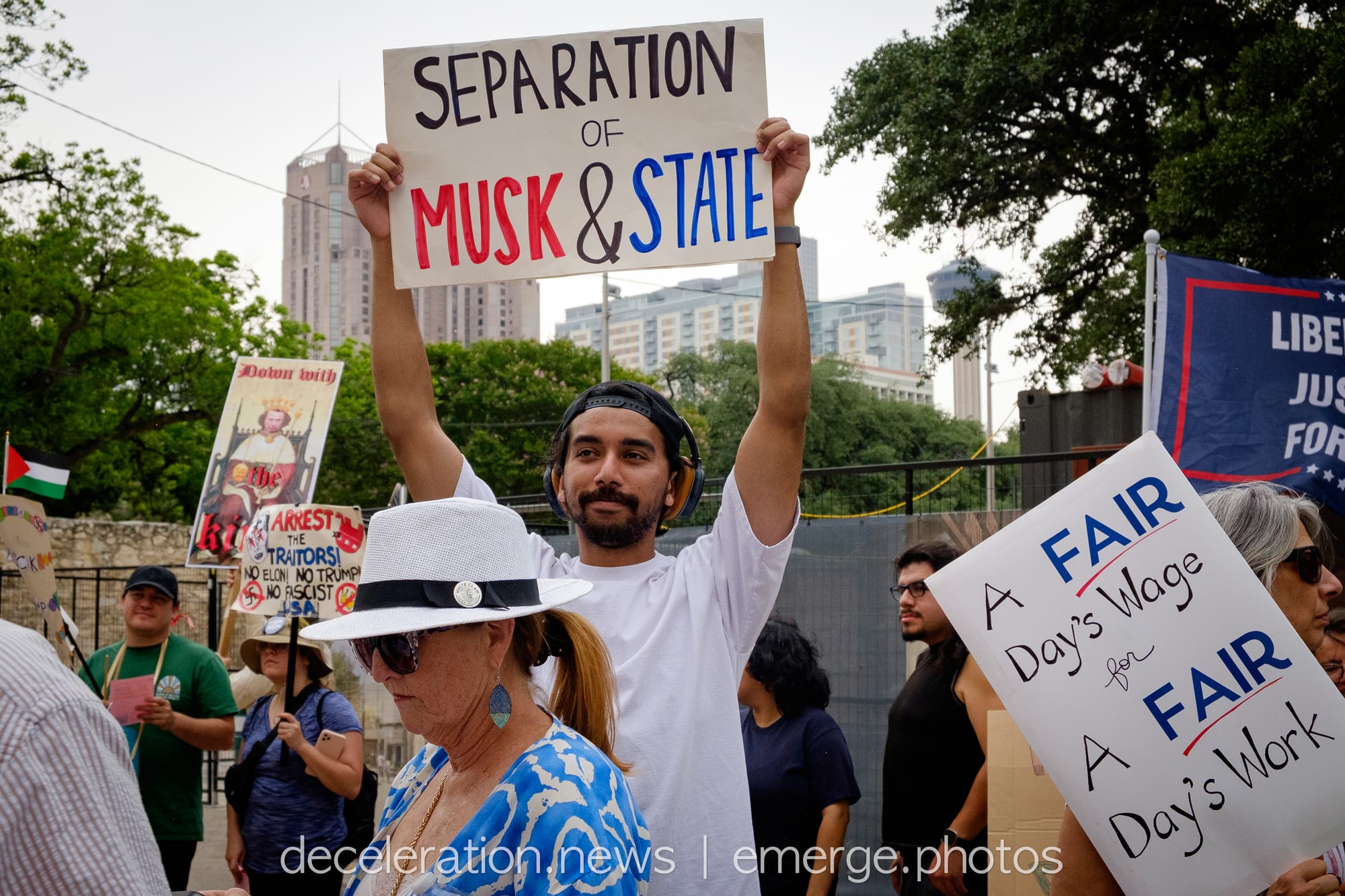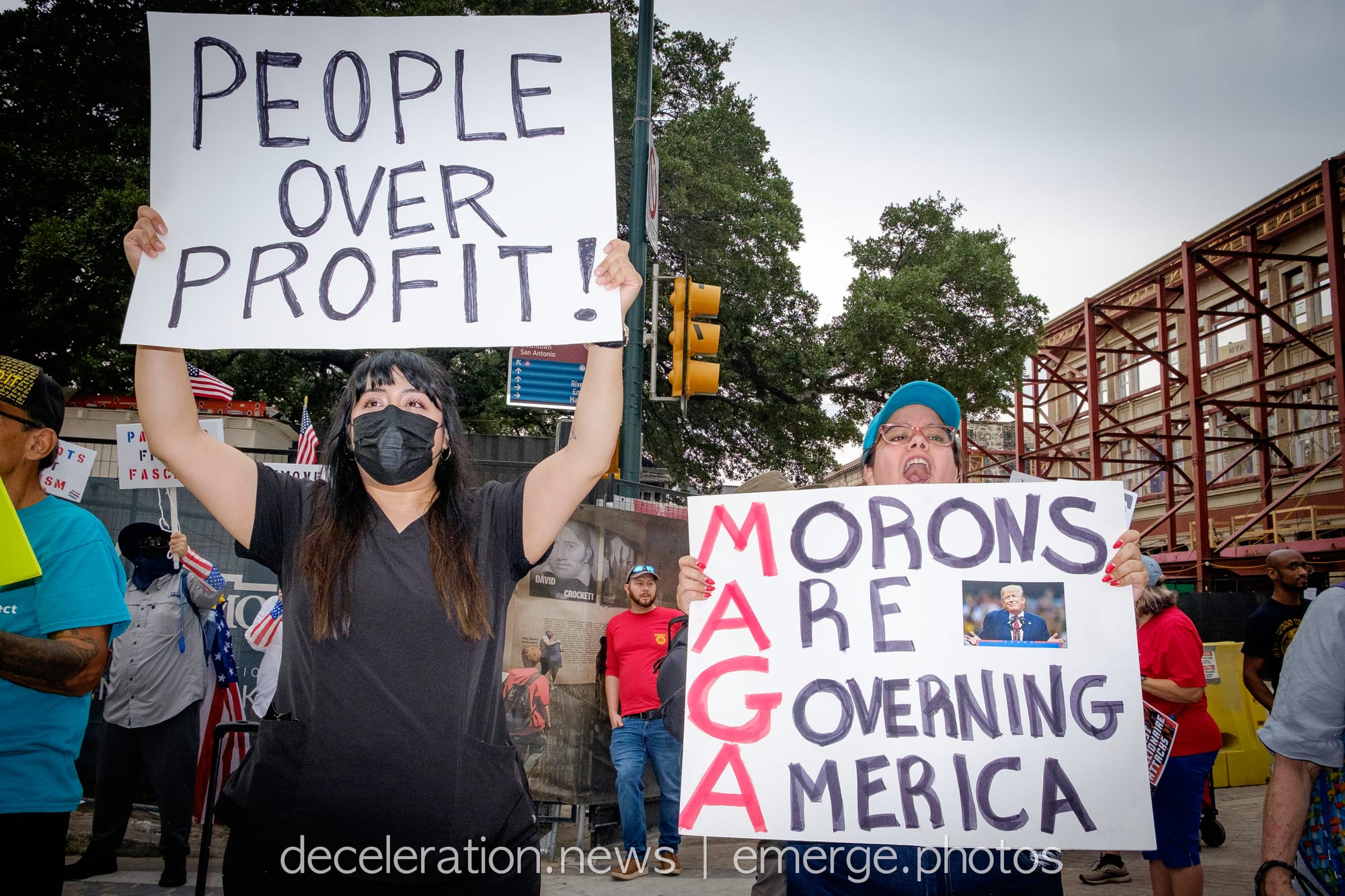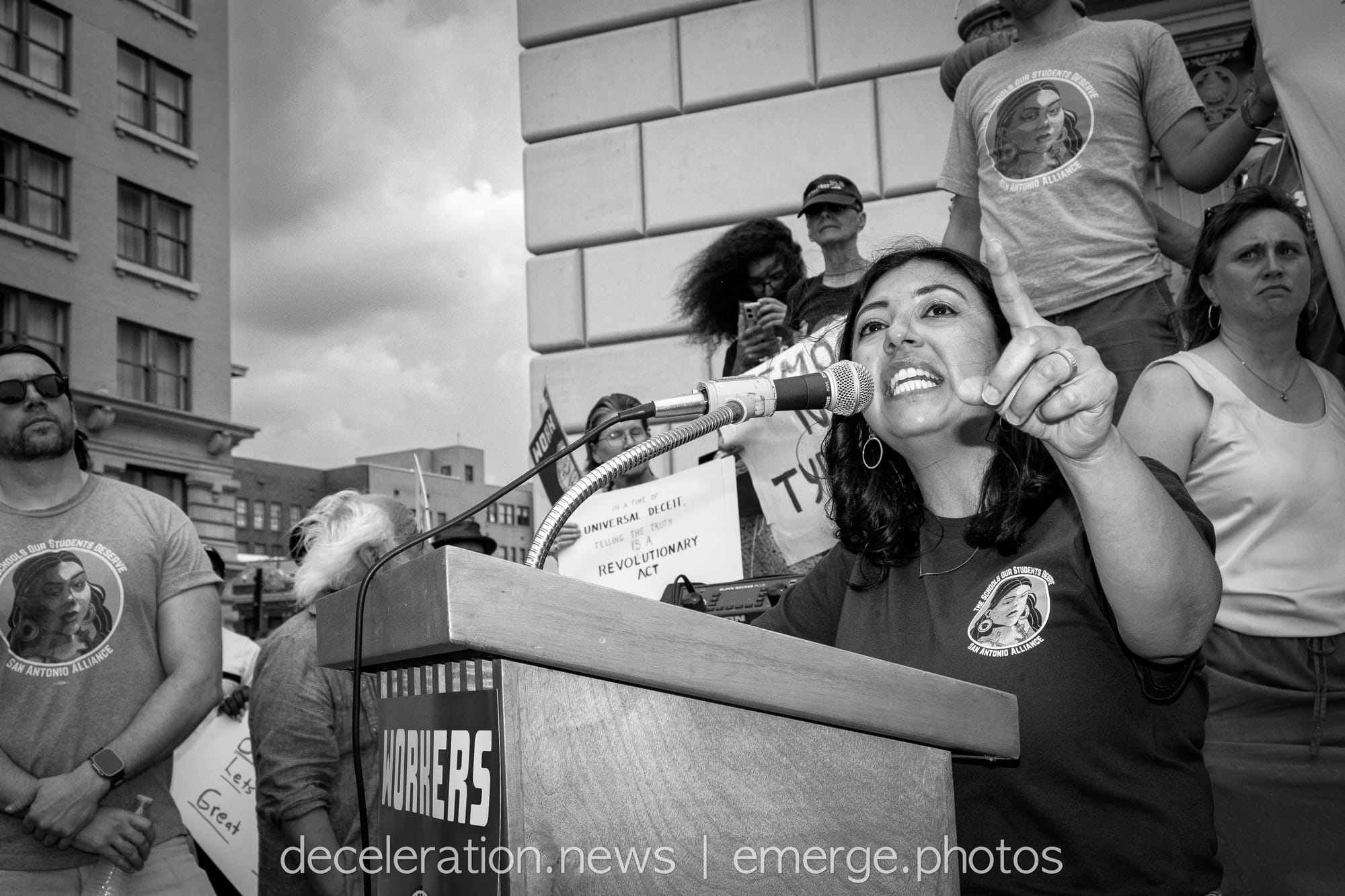 Later that day, between 200 and 300 area residents converged on a downtown federal building adjacent to the storied Alamo (described both as a “Shrine to Texas Liberty” and a “Shrine to White Supremacy“) as part of an ongoing international protests decrying the abuses of the Trump administration and its attacks on federal workers, social service programs, and human rights.
