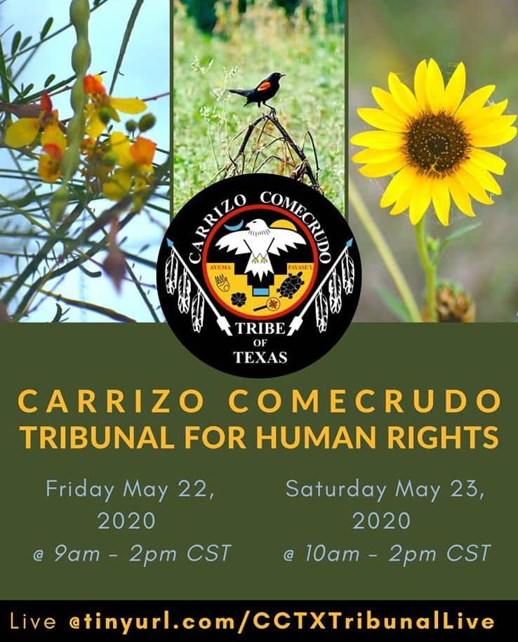 A two-day online event, the Carrizo Comecrudo Tribe of Texas will host their Tribunal For Human Rights on Friday, May 22 (9am-2pm CST) and Saturday, May 23 (10am-2pm CST), in partnership with the Gulf Coast Center for Law and Policy (GCLP) and the Gulf South for a Green New Deal Coalition.