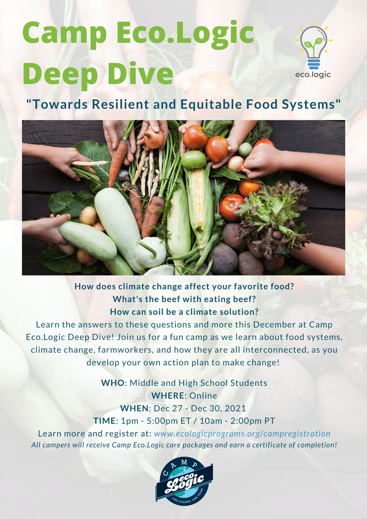 Camp Eco.Logic is one such example of a program designed to educate the youth in fun and engaging ways so they can learn from each other, learn from environmental experts and practitioners, and come up with solutions they can work to implement in their communities. This December break, Camp Eco.Logic has a Deep Dive virtual program focused on “Resilient and Equitable Food Systems.” The holiday season now upon us is marked by food traditions—a great way for students to think deeply about their connections to food, the life cycle of food products, food accessibility, and food waste.