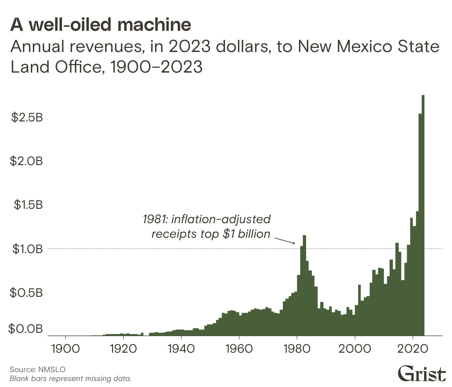 The New Mexico State Land Office, sometimes described by state legislators as “the most powerful office you’ve never heard of,” has been a successful operation for a very long time. Since it started reporting revenue in 1900, it’s generated well over $42 billion in 2023 dollars.