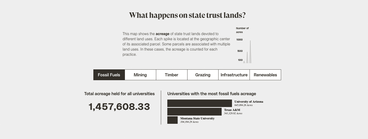 Nearly 25 percent of land-grant university trust lands are designated for either fossil fuel production or the mining of minerals, like coal and iron-rich taconite. Grazing is permitted on about a third of the land, or approximately 2.8 million surface acres. Those parcels are often coupled with subsurface rights, which means oil and gas extraction can occur underneath cattle operations, themselves often a major source of methane emissions. Timber, agriculture, and infrastructure leases — for roads or pipelines, for instance — make up much of the remaining acreage.