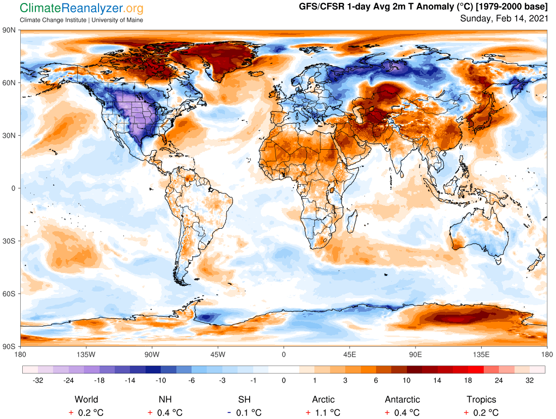 It’s cold. Here. But when discussing global warming it’s always good to take the global temperature. Here’s a map that displays Sunday’s temperature anomalies; those areas colder than normal for this time of year are shades of blue, while those that are hotter are red. The truth remains that in this time of weather extremes hotter-than-average events exceed colder-than-average by a factor of two to one.