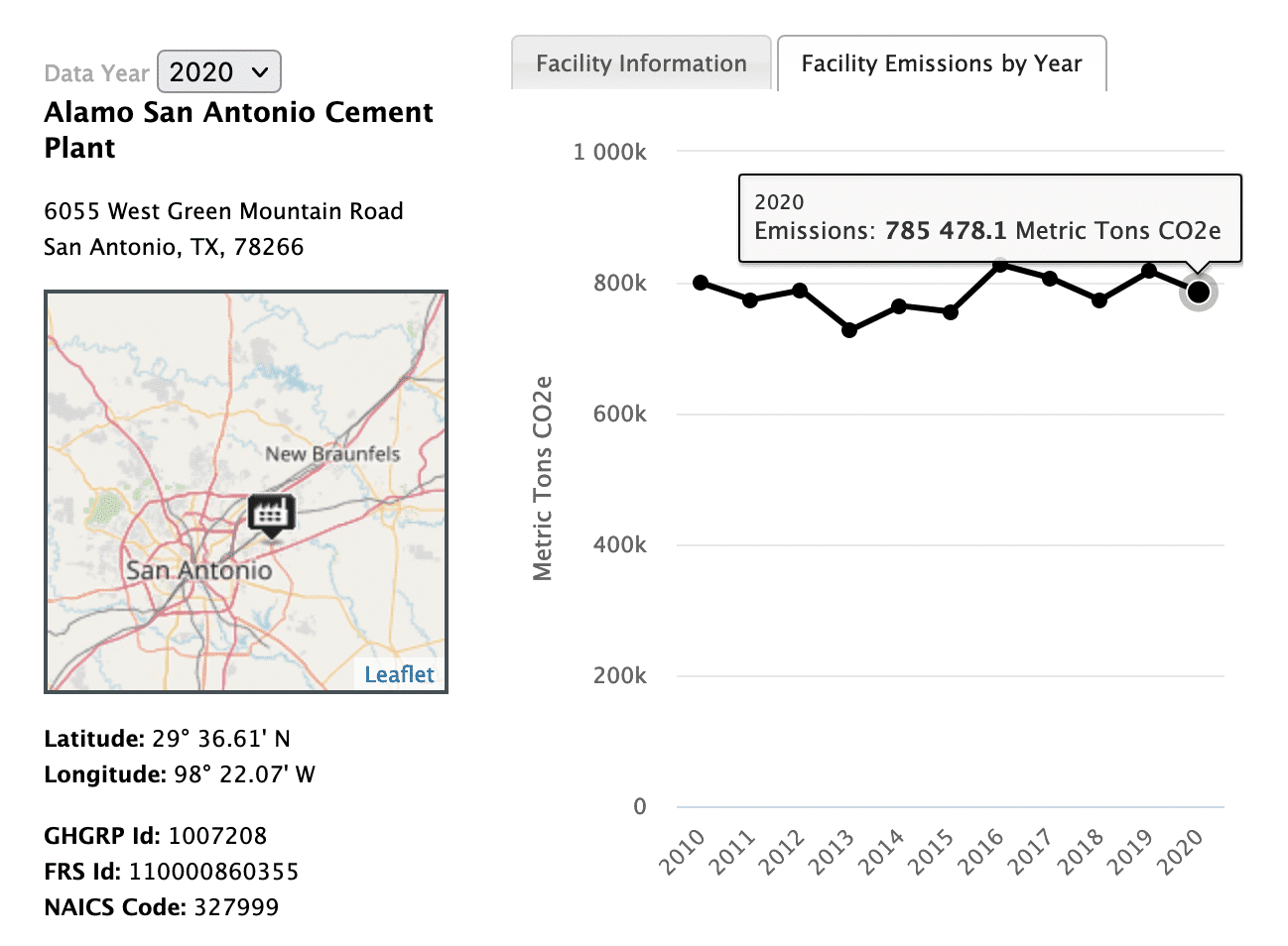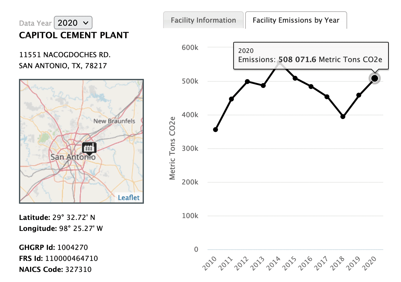 Emissions at Capitol Cement in northeast San Antonio continued to rise during 2020, a rarity among the area’s heaviest polluters. Image: Google Maps
