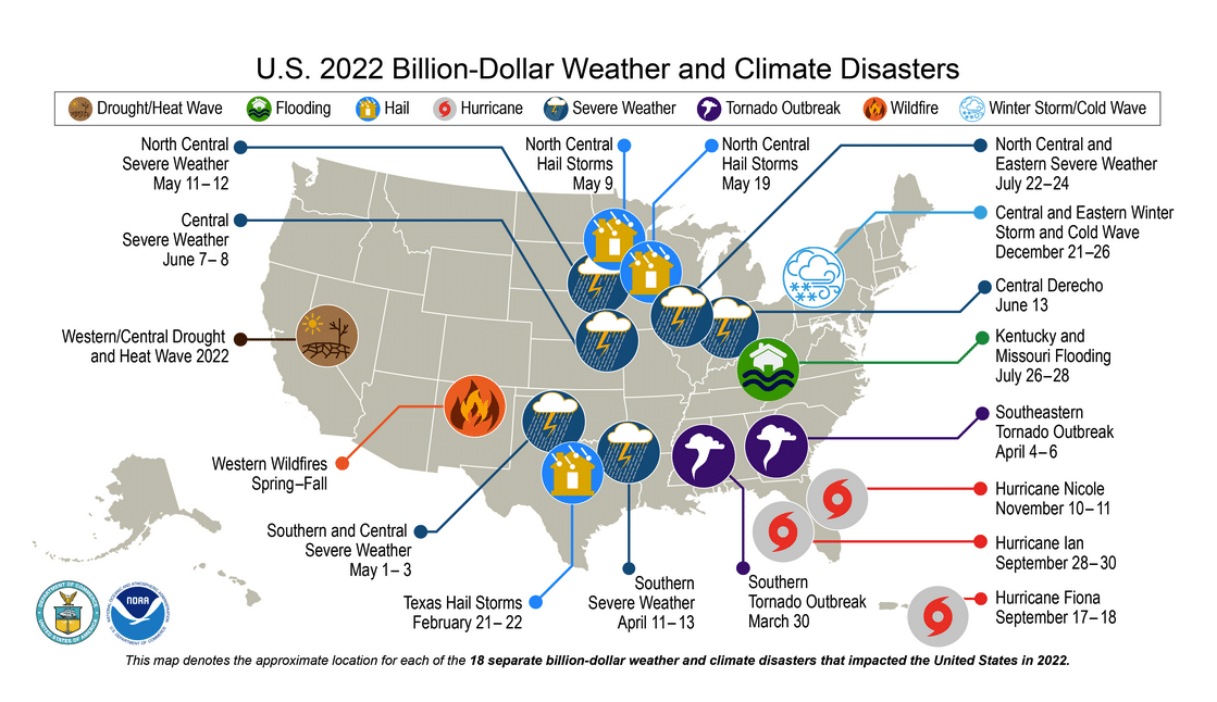 - The US has experienced 332 weather and climate related disasters since 1980 where overall damages reached or exceeded US$1 billion with the frequency of these events increasing in recent years. In the last five years, there’s been an average of 18 of these events per year.