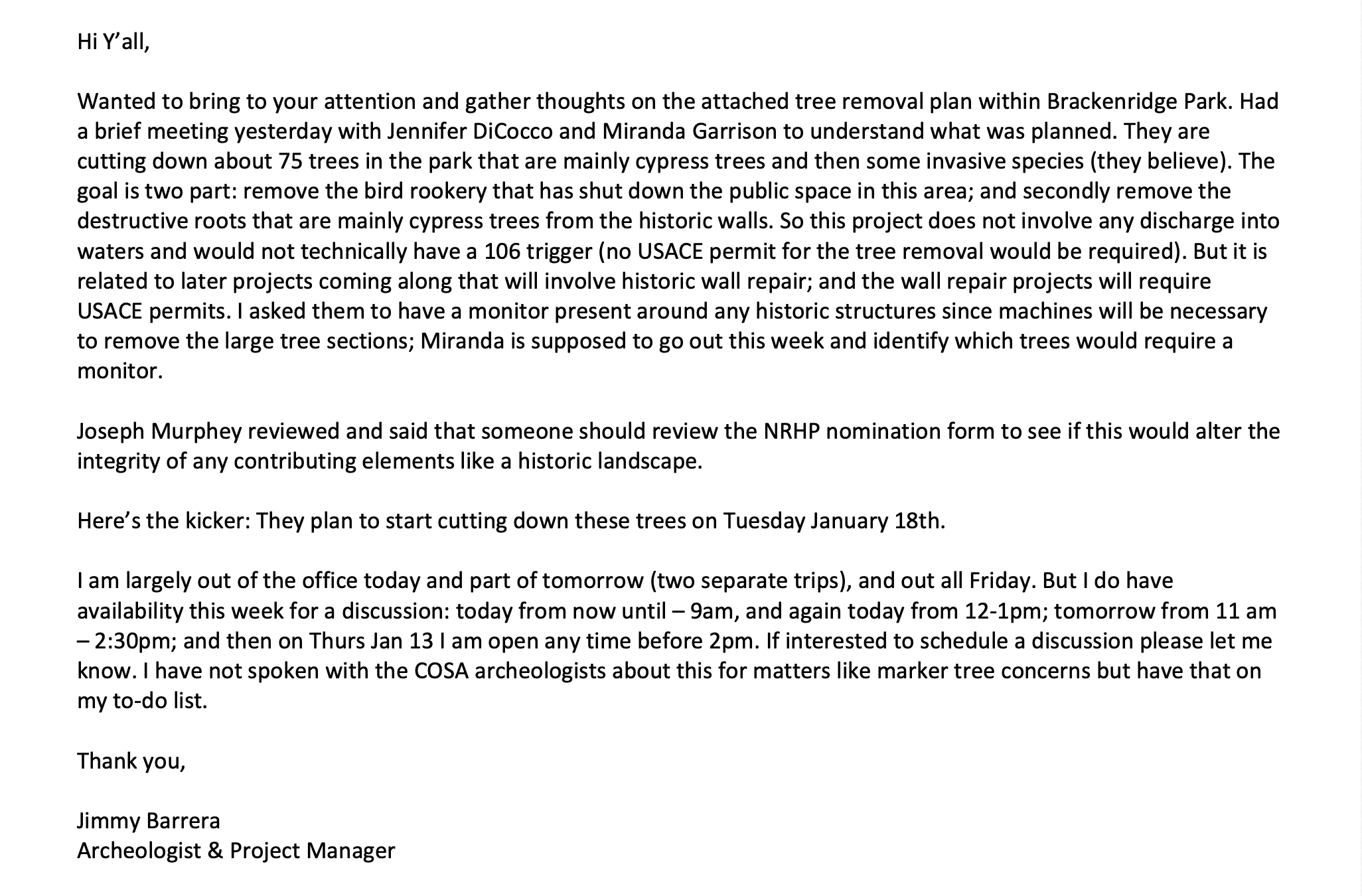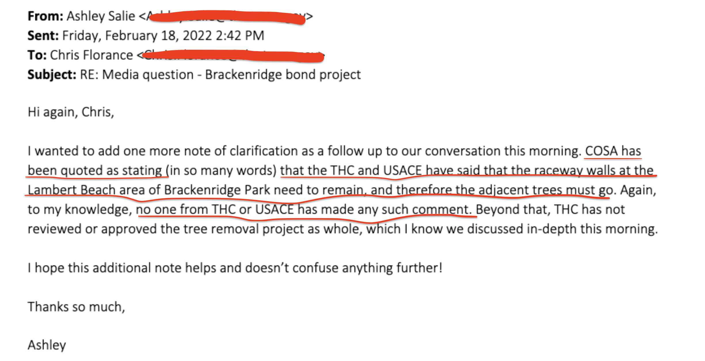 “I wanted to add one more note of clarification as a follow up to our conversation this morning. COSA has been quoted as stating (in so many words) that the THC and USACE have said the raceway walls at the Lambert Beach area of Brackenridge Park need to remain, and therefore the adjacent trees must go. Again, to my knowledge, no one from THC or USACE has made any such comment. Beyond that, THC has not reviewed or approved the tree removal project as a whole, which I know we discussed in-depth this morning.”
