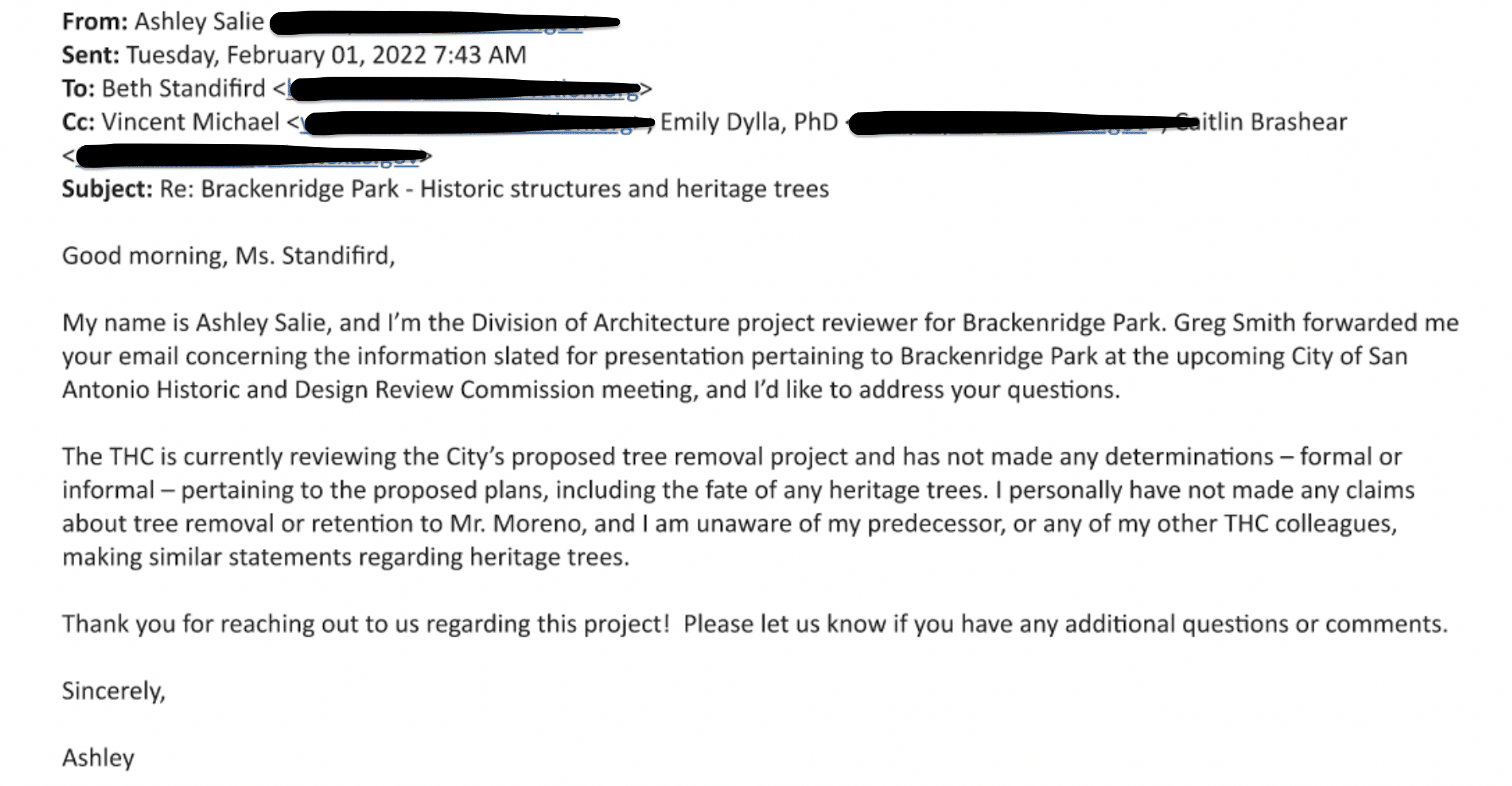 However, based upon a review of dozens of internal THC email communications and at least one formal letter to the City of San Antonio’s Public Works Department, it appears that many of these statements are not accurate. In several messages relayed internally within the THC and one email shared with an employee of the SA Conservation Society Foundation, THC staff lamented what they described as Moreno’s mischaracterizations of the Commission’s position. More broadly, several emails complained that City staff was rushing through permits in San Antonio for the Sunken Gardens Theatre and the proposed tree removal at Lambert Beach while failing to first secure the necessary clearance from the THC.