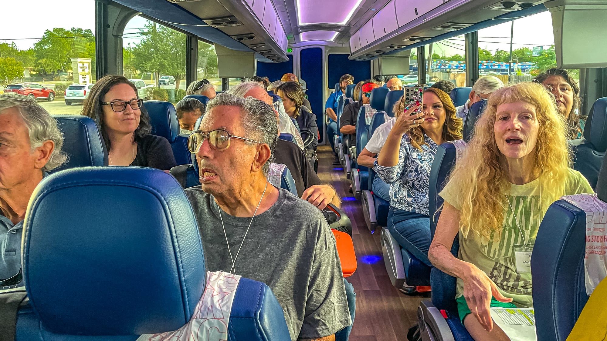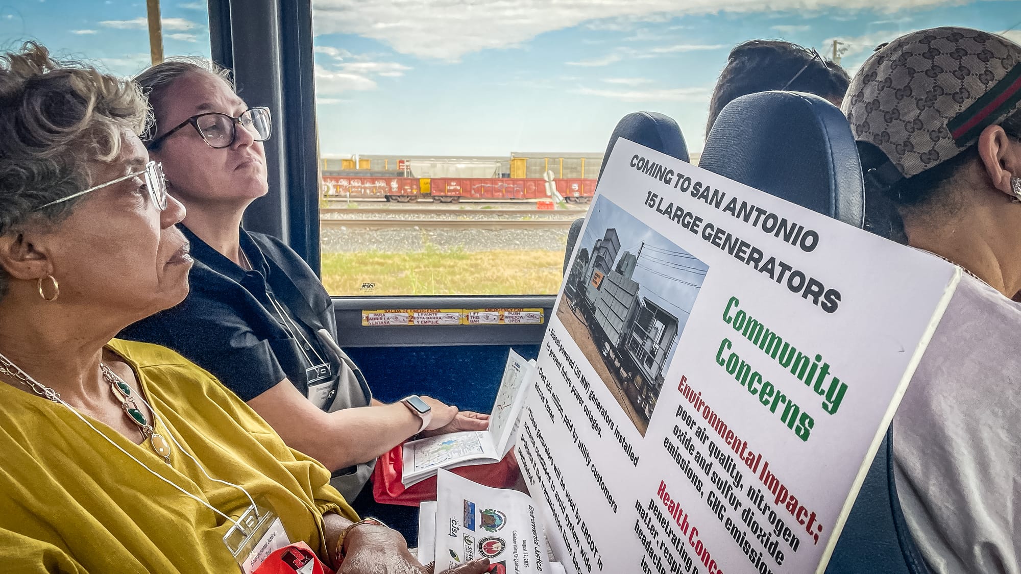 The end of our tour ventured south of New Laredo Highway’s back-to-back recycling yards, the city unwinding itself into brush and blue sky and undeveloped land. Almost—on one of our final stops, we idled outside the Milton B. Lee gas-fired peaker plant in rural Bexar County, connecting “the things we can see,” as Lopez said, meaning the local concentration of polluting facilities in Southside neighborhoods, to “other layers that we can’t [see], like climate change,” driven by the burning of fossil fuels for power generation, as at Milton B. Lee.