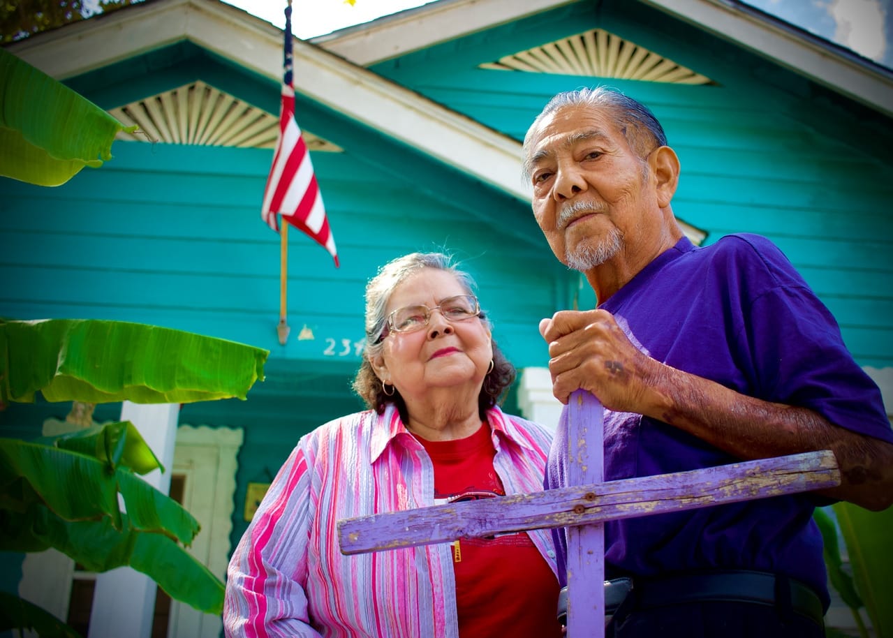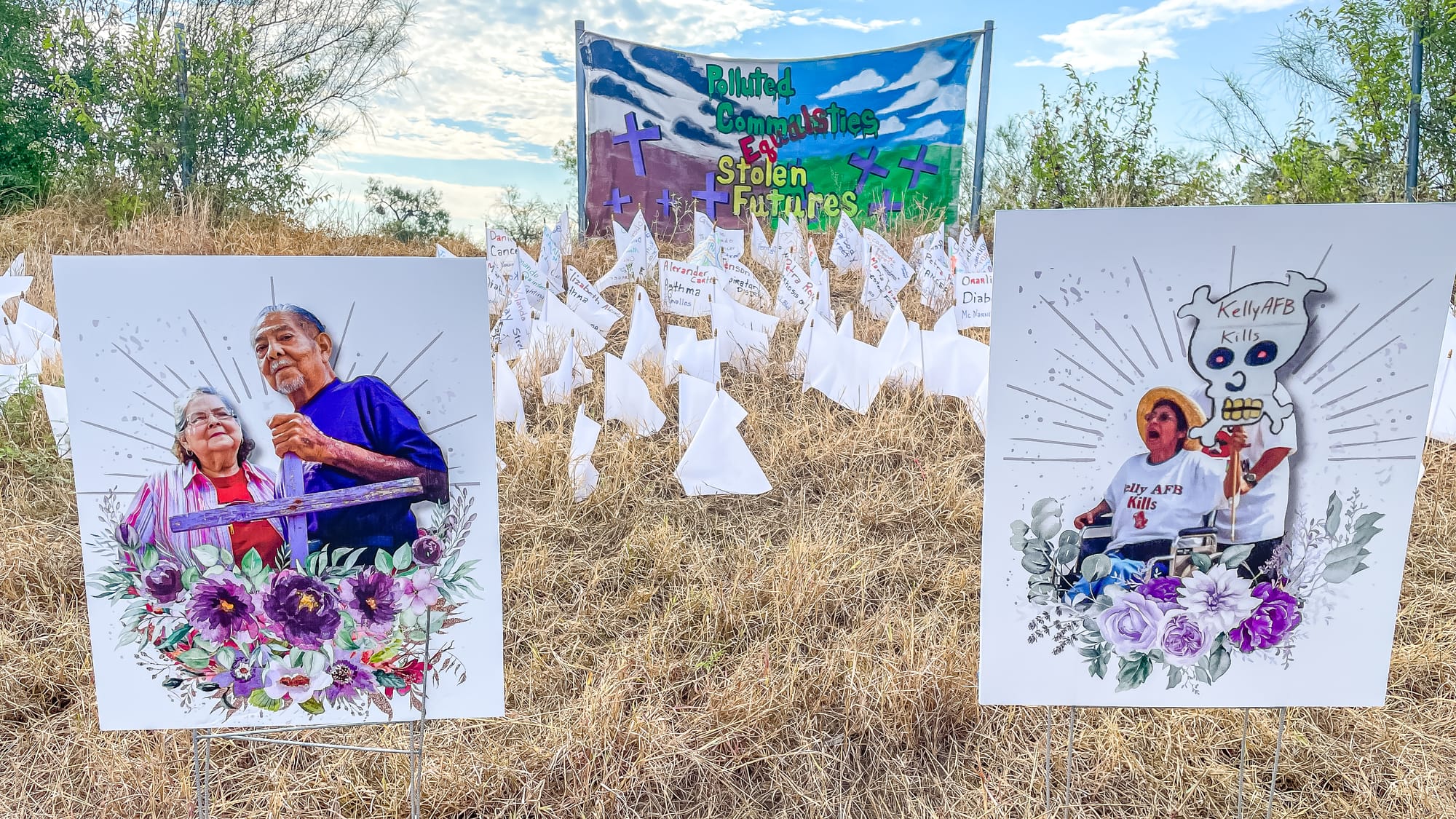 Starting just outside the bounds of the former Kelly Field, we began in the 1960s with a memorial for all those impacted by Kelly’s contamination of local soil, air, and groundwater, a plume of TCE that became known as the “toxic triangle.” Deboarding the bus, attendees crowded beneath a painted banner planted at the top of a small hill—“Polluted Communities Equal Stolen Futures”—which overlooked a field of small white flags bearing the names of neighbors sick or deceased. At bottom were portraits of longtime environmental justice activists from the neighborhood who have since passed, including Robert and Lupe Alvarado (see Deceleration’s interview with the couple from 2021 below).