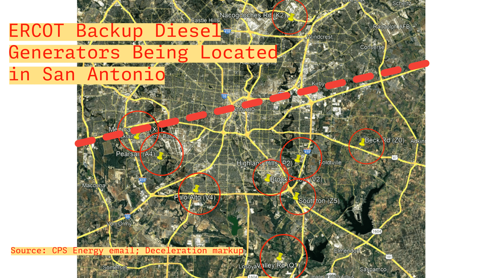 In emails shared with Deceleration, community questions to CPS Energy about where exactly these generators would be located produced a letter sent to customers living within a mile of each generator, forwarded by CPS Community Relations Advocate Jess Copeland, along with a map of locations. Of the nine CPS substations slated to receive a diesel generator, one is located on the Northeast side, near a cement plant ranked as one the city’s biggest greenhouse gas emitters.