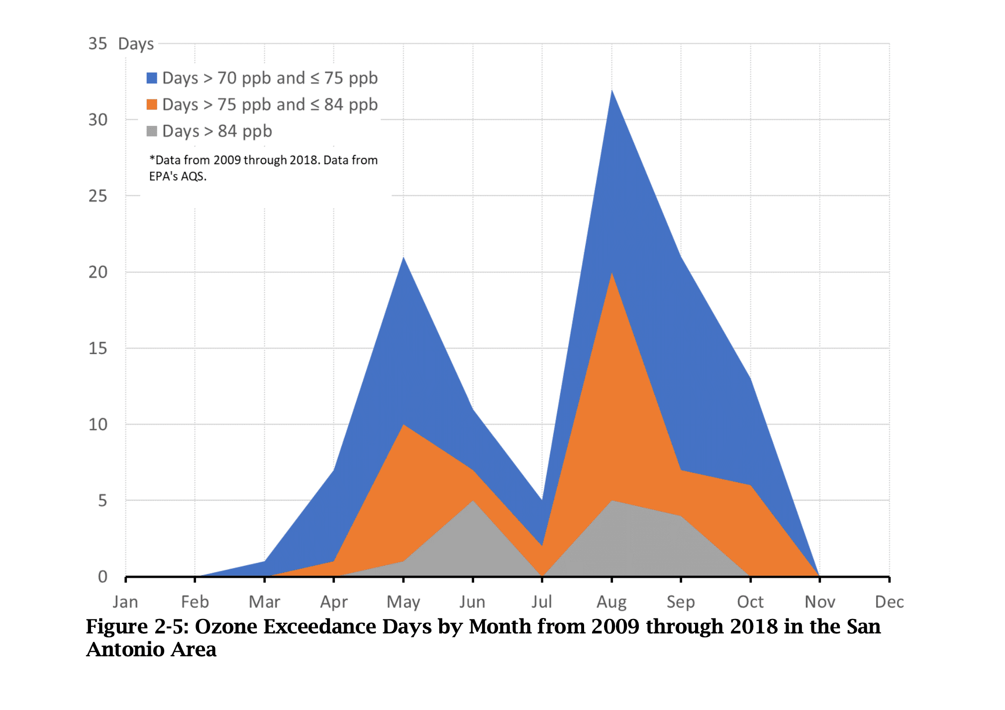High ozone events are linked to childhood asthma, heart attacks, and premature death. In 2017, the City of San Antonio released a report stating that between 17 and 32 deaths (valued together at $220M in 2014 dollars) in San Antonio could be avoided by improving local air quality. However, as worked out by the Alamo Area Council of Governments, the economic threat of a moderate nonattainment EPA classification came with a much higher price tag—potentially tens of billions of dollars. Needless to say, when EPA found Bexar County in “marginal nonattainment” for the first time, local leaders urged a reconsideration. In a letter to then-EPA Administrator Scott Pruitt, Mayor Ron Nirenberg credited local initiatives with helping drive ozone levels of 91 parts per billion (ppb) ozone in 2004 to 73 ppb in 2016. He pledged that local pollution levels would be back into compliance by 2020. (Spoiler: They weren’t.)