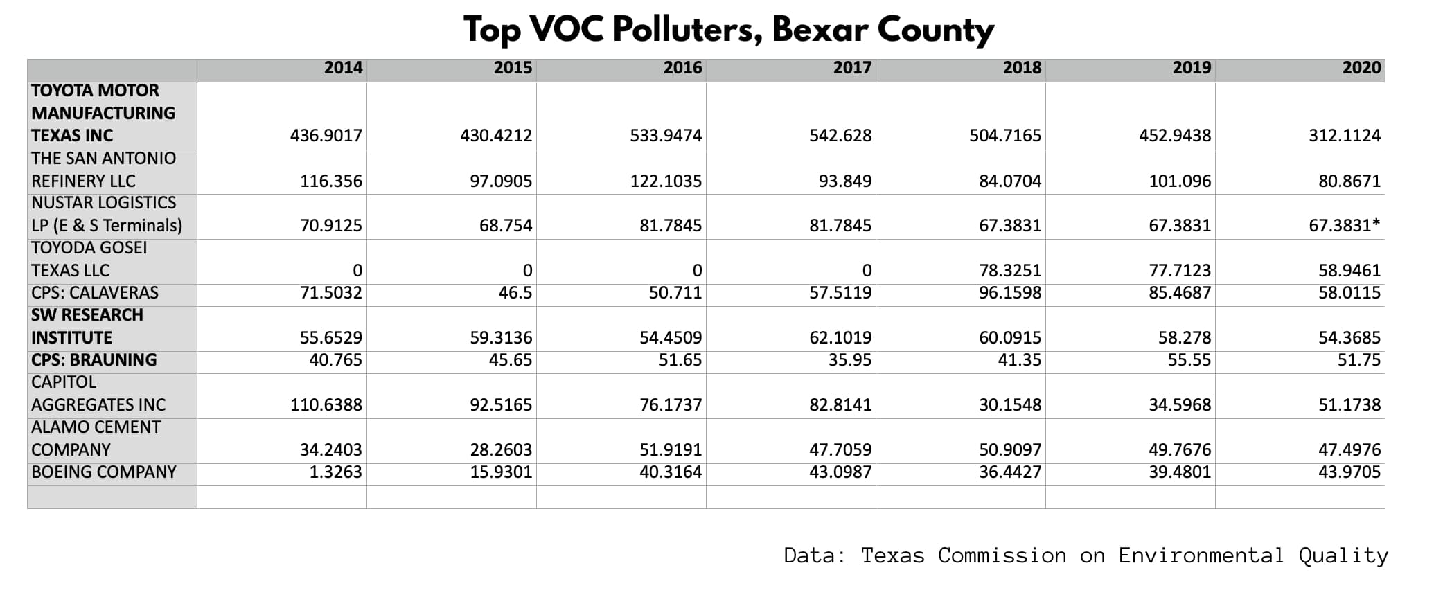 Ground-level ozone is created when pollution from gas-powered cars and trucks, power plants, refineries, and other sources react in the presence of sunlight. That pollution can come from nitrogen oxides (NOX), such as from the CPS Energy’s coal-powered JK Spruce coal plant, or volatile organic compounds (VOCs). Nearly half of all industrially-generated NOX in Bexar County comes from San Antonio’s last remaining coal plant. Meanwhile, the leading source of industrially released VOCs has gotten far less attention: Toyota Manufacturing.