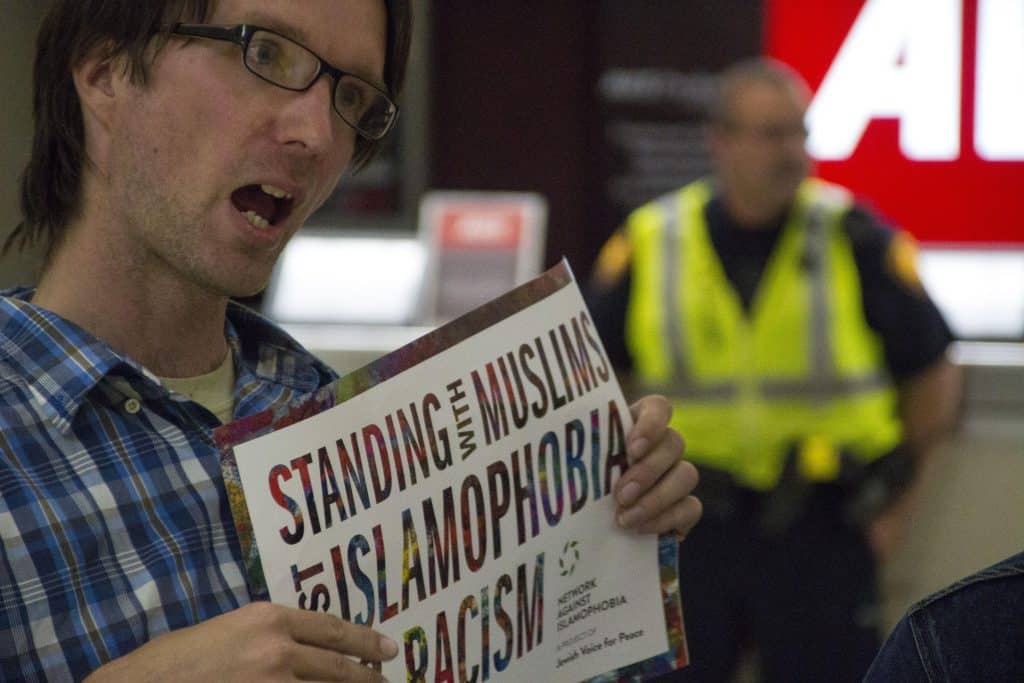 Part of a gathering movement in San Antonio, Texas, and reflective of actions taking place across the country and around the world, a group of roughly 40 area residents occupied San Antonio International Airport on Sunday, January 29, 2017, to oppose the recent Trump Executive Order on visas and refugees. Trump’s action shut the border to citizens of seven Muslim-majority countries for 90 days, suspended all refugee admission for 120 days, and indefinitely blocked any Syrian refugees from entering the United States.