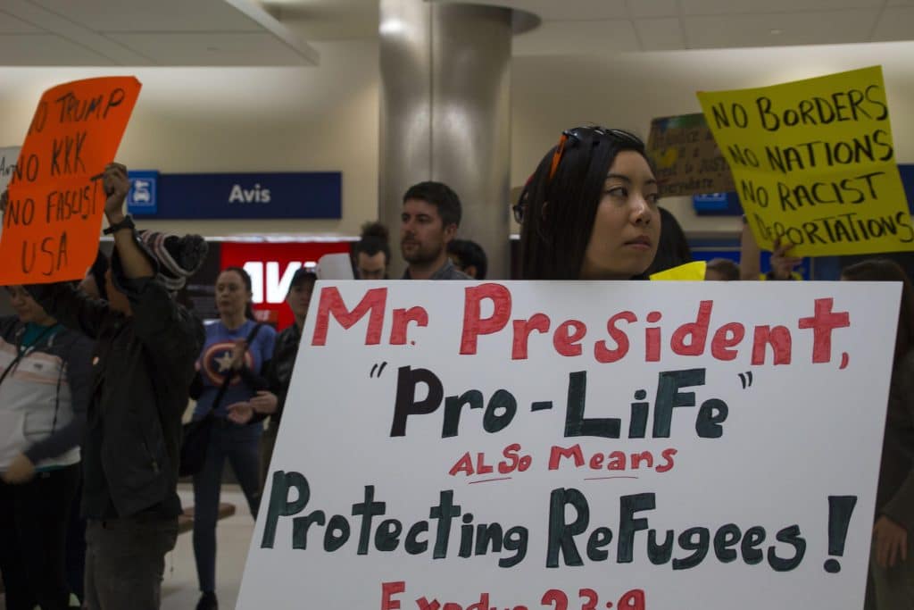 Protesters gathered primarily as an expression of welcome for any refugees who may be arriving in San Antonio–particularly, perhaps, if any should still be closeted by Homeland Security as they had been at other U.S. airports that weekend. In a running string of chants and songs, the group decried the Trump order as part-and-parcel of his racist election-season promises to build a wall between the U.S. and Mexico, enact a total ban on Muslims entering the United States, and set up a Muslim registry to intensely police members of the faith within the country.