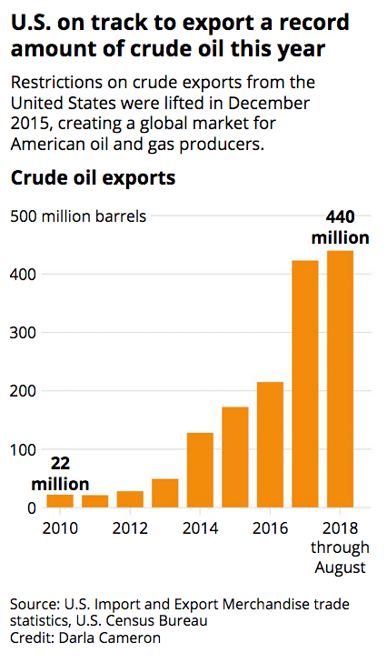 In late 2015, Congress cut a deal to lift 40-year-old restrictions on the export of crude oil. That opened the floodgates. The U.S. sold 230 million more barrels of crude to other countries in the first half of this year than it did three years earlier — a surge made possible by a virtually identical spike in Permian production.