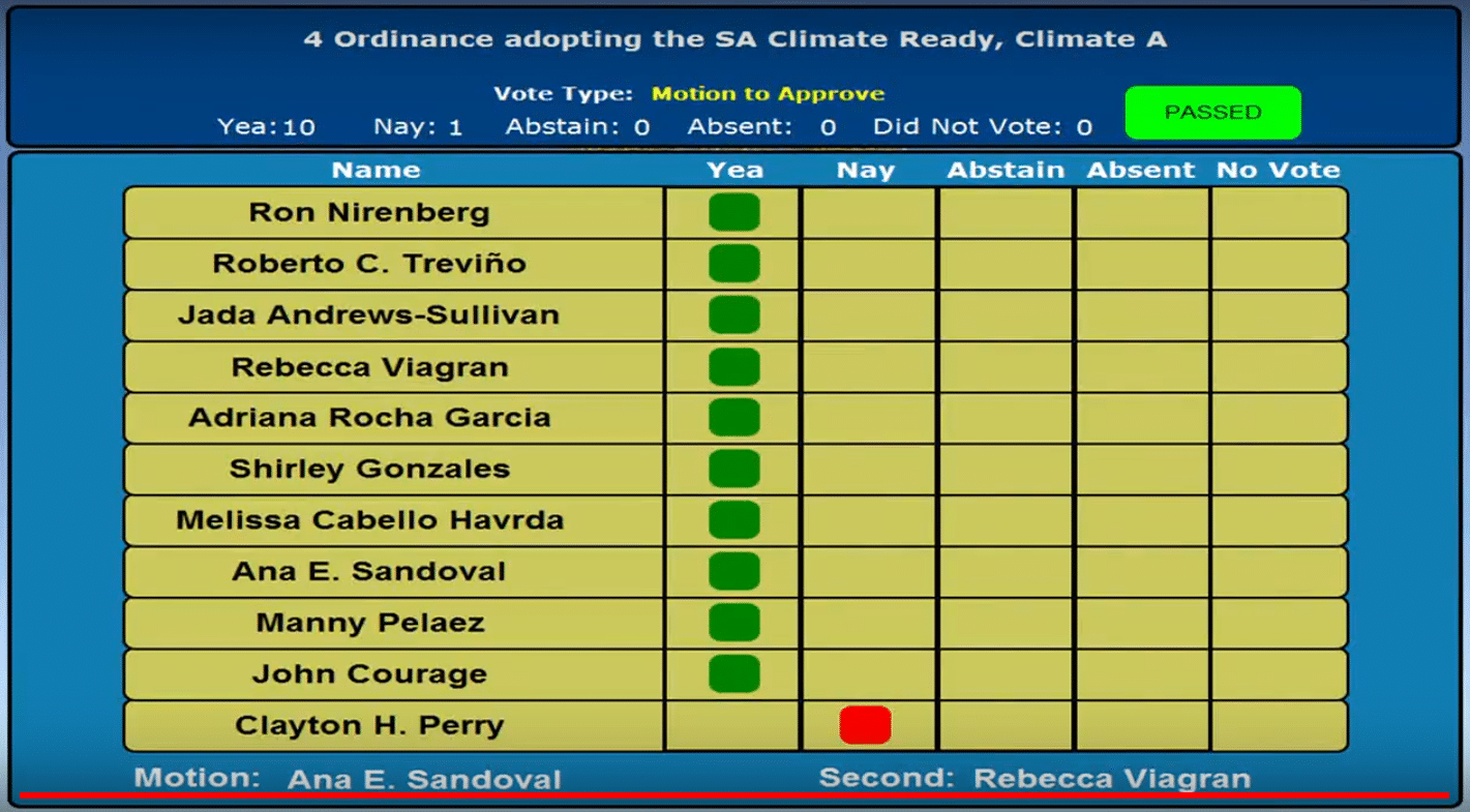 See video of each council member’s comments below. Or skip to the bottom to watch the Pubic Comments portion of the meeting, view a presentation on the CAAP by San Antonio Chief Sustainability Officer Doug Melnick, or see the entire proceedings as it unfolded.